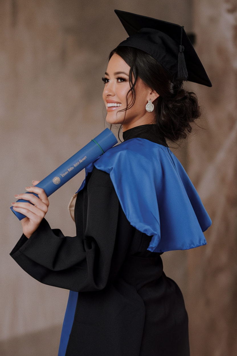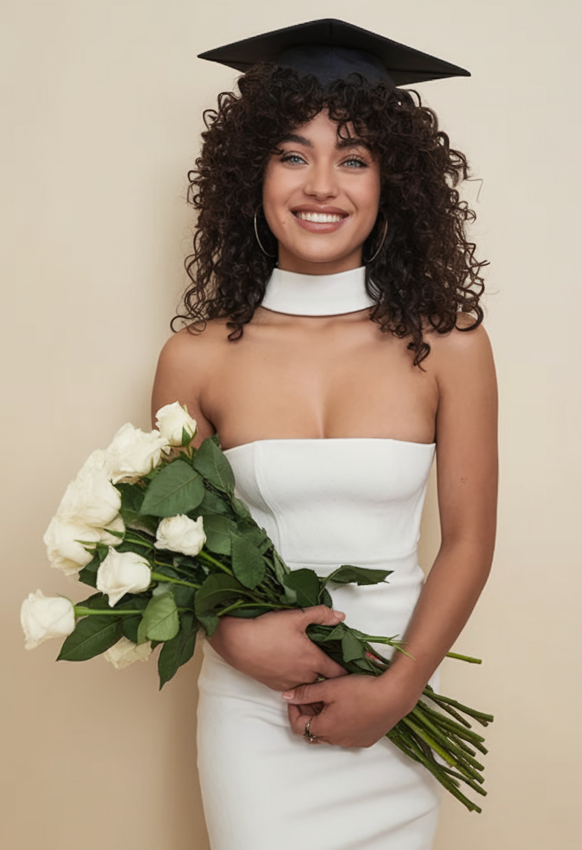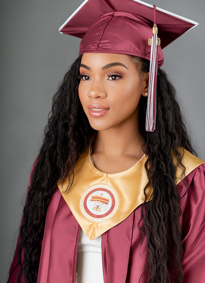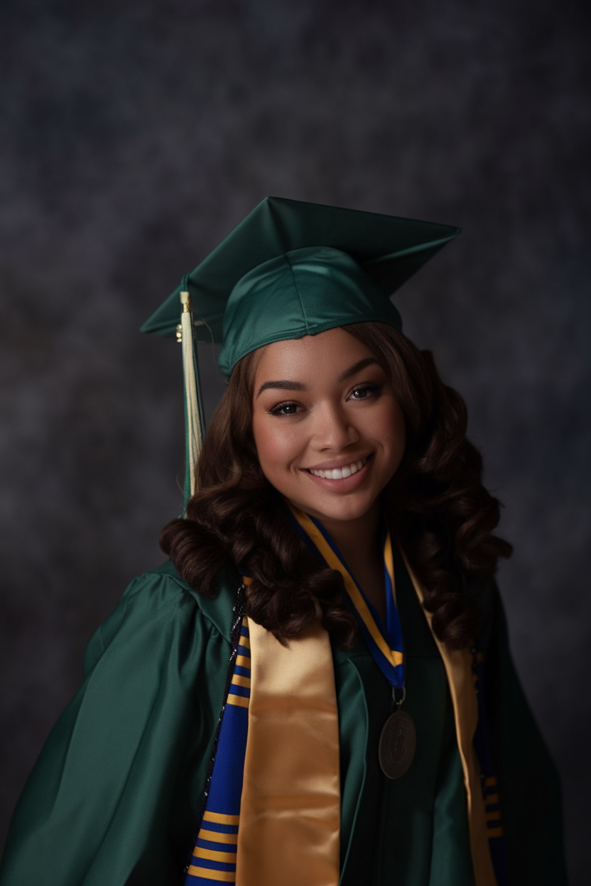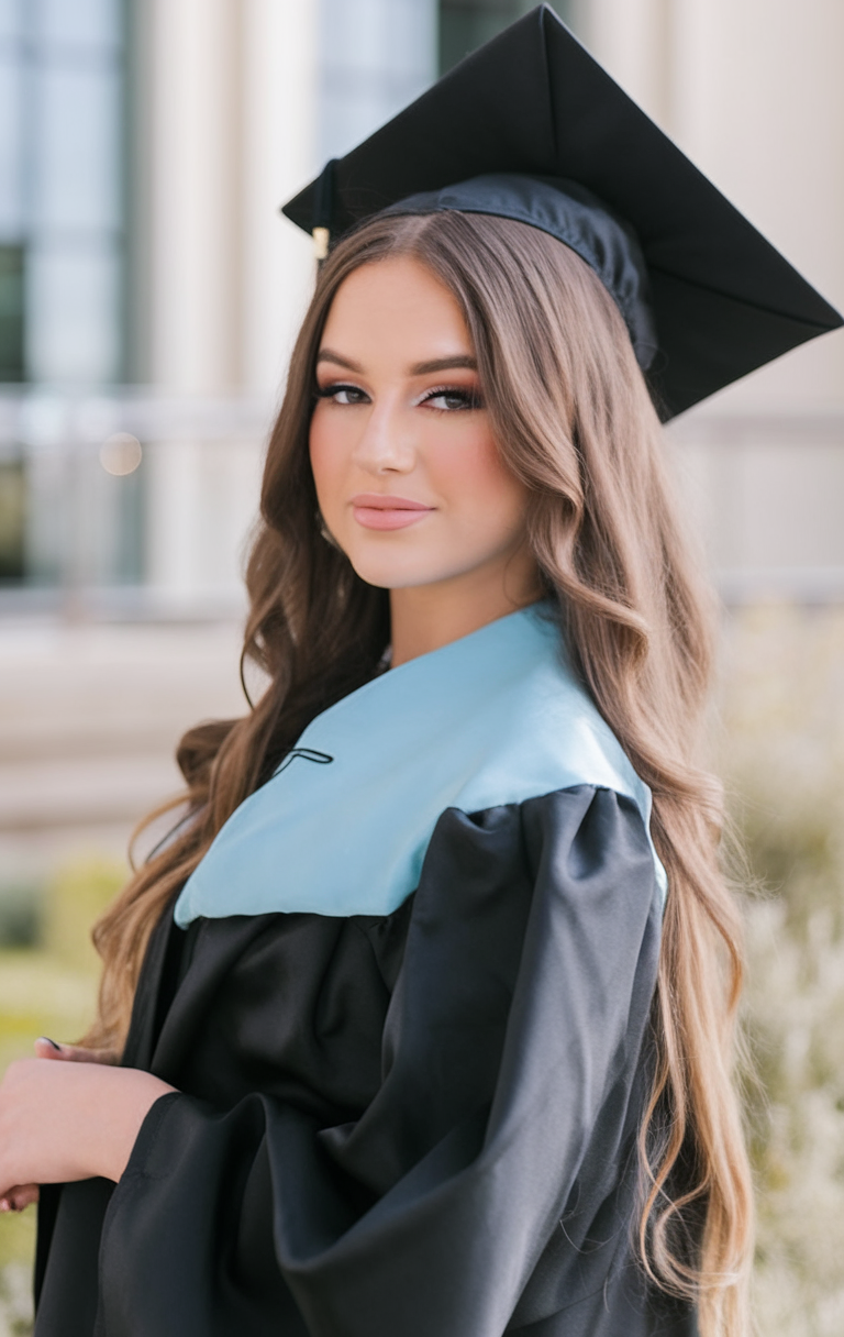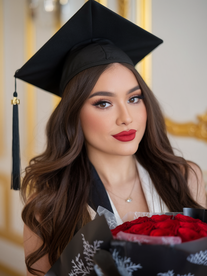 Here, the hair is styled in long, flowing waves that add volume and movement. The rich black hue enhances the shine and depth of the waves, complementing the elegant makeup and hair combination. This style is ideal for those looking for a picture-perfect finish that pairs well with a traditional graduation cap. The waves are loose yet defined, making this look both effortless and sophisticated for the big day.
