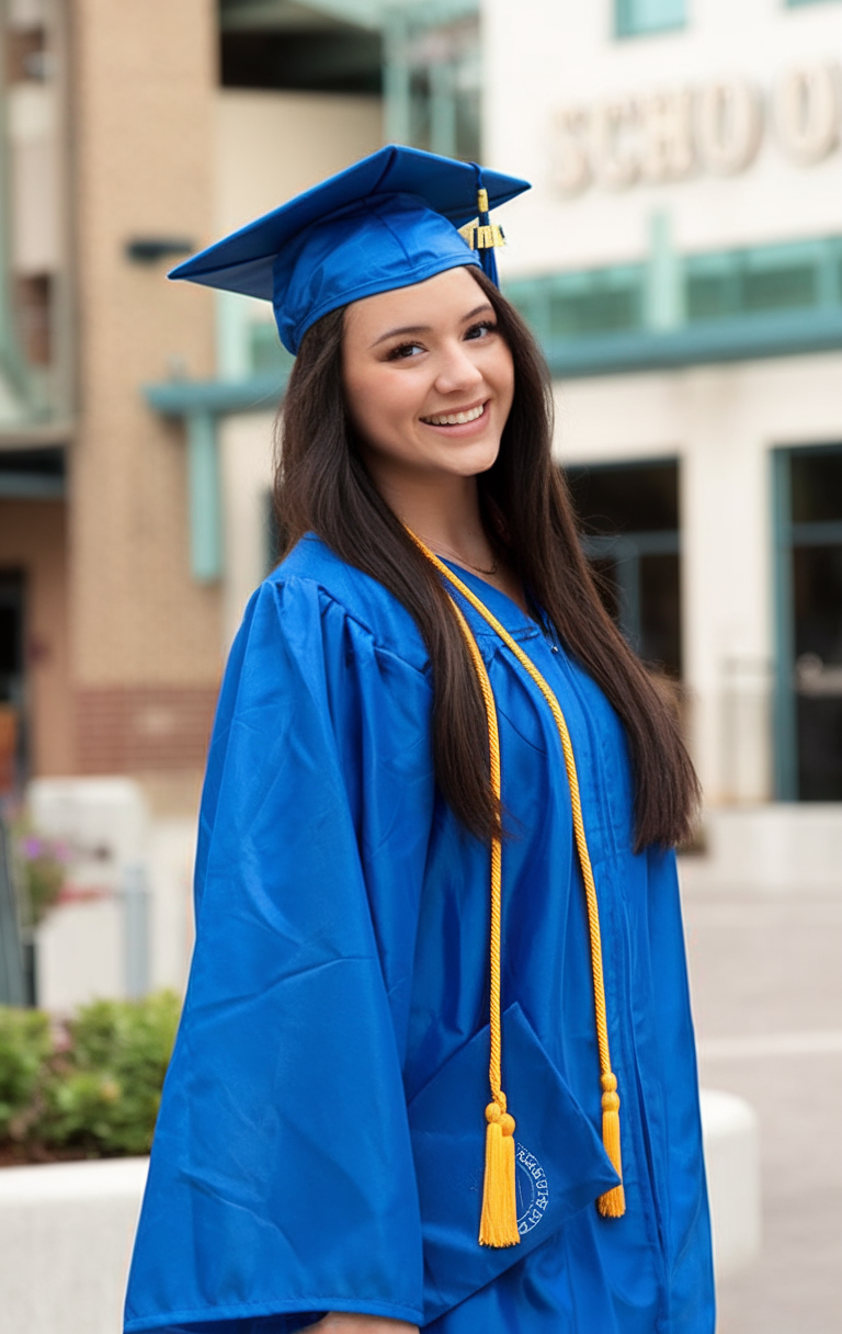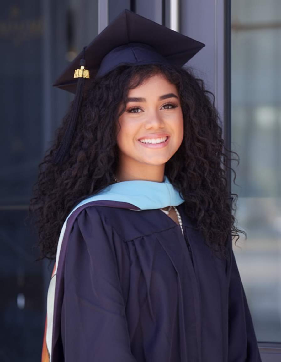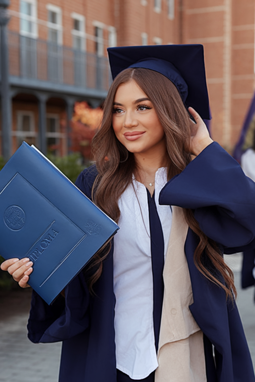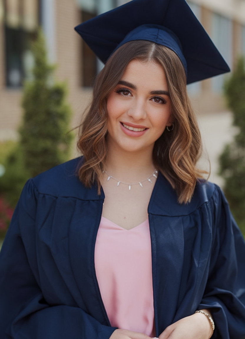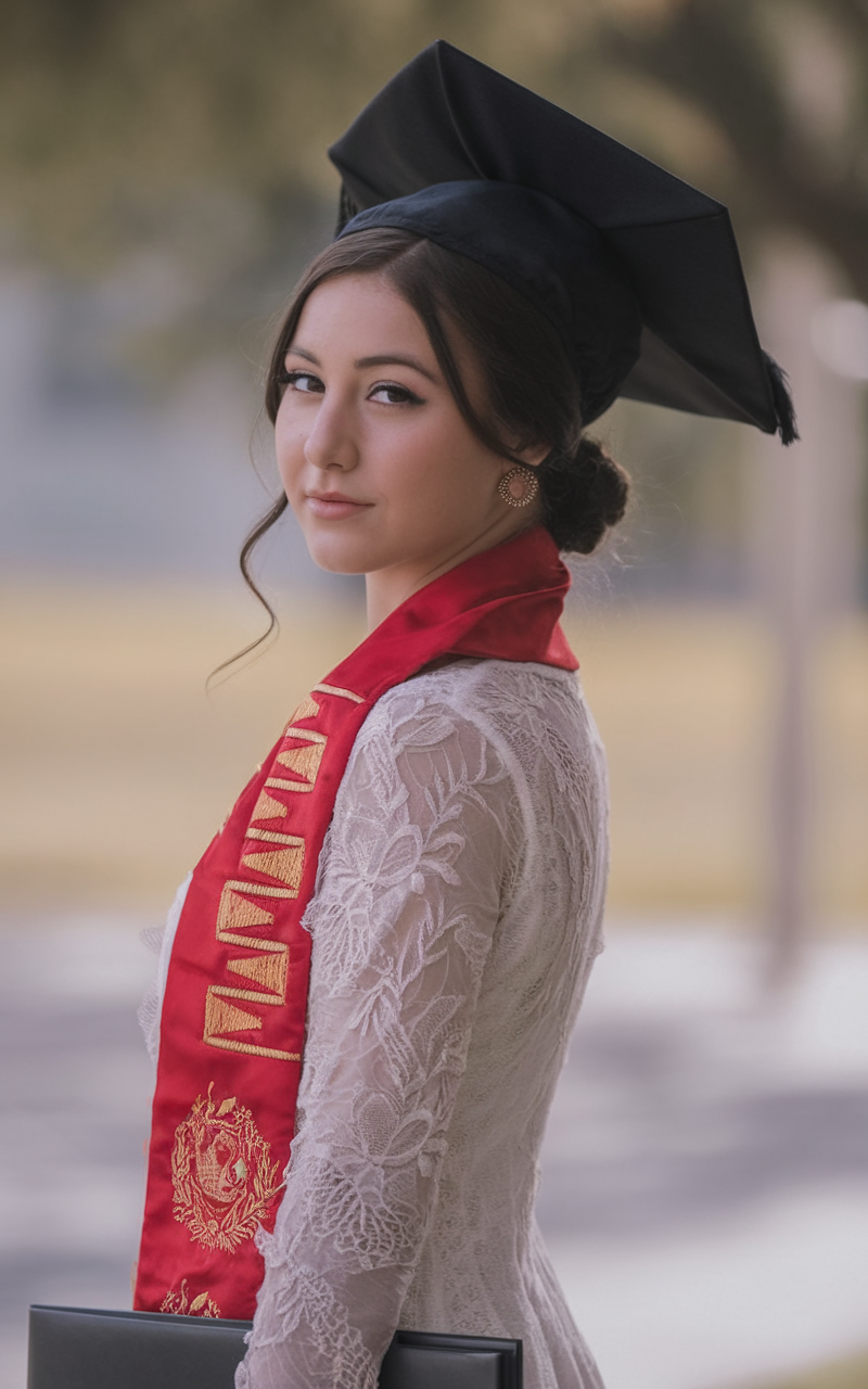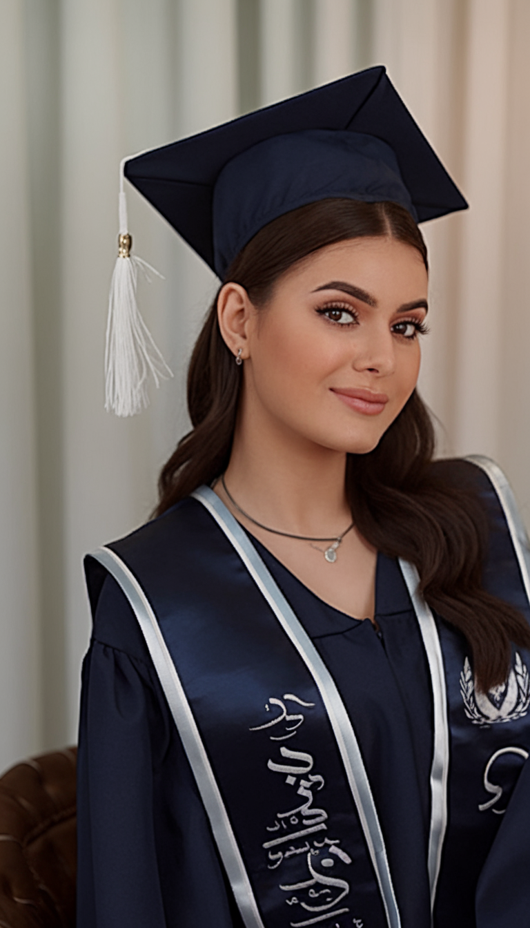 Here, the hair is styled in long, flowing waves that add volume and movement. The rich black hue enhances the shine and depth of the waves, complementing the elegant makeup and hair combination. This style is ideal for those looking for a picture-perfect finish that pairs well with a traditional graduation cap. The waves are loose yet defined, making this look both effortless and sophisticated for the big day.