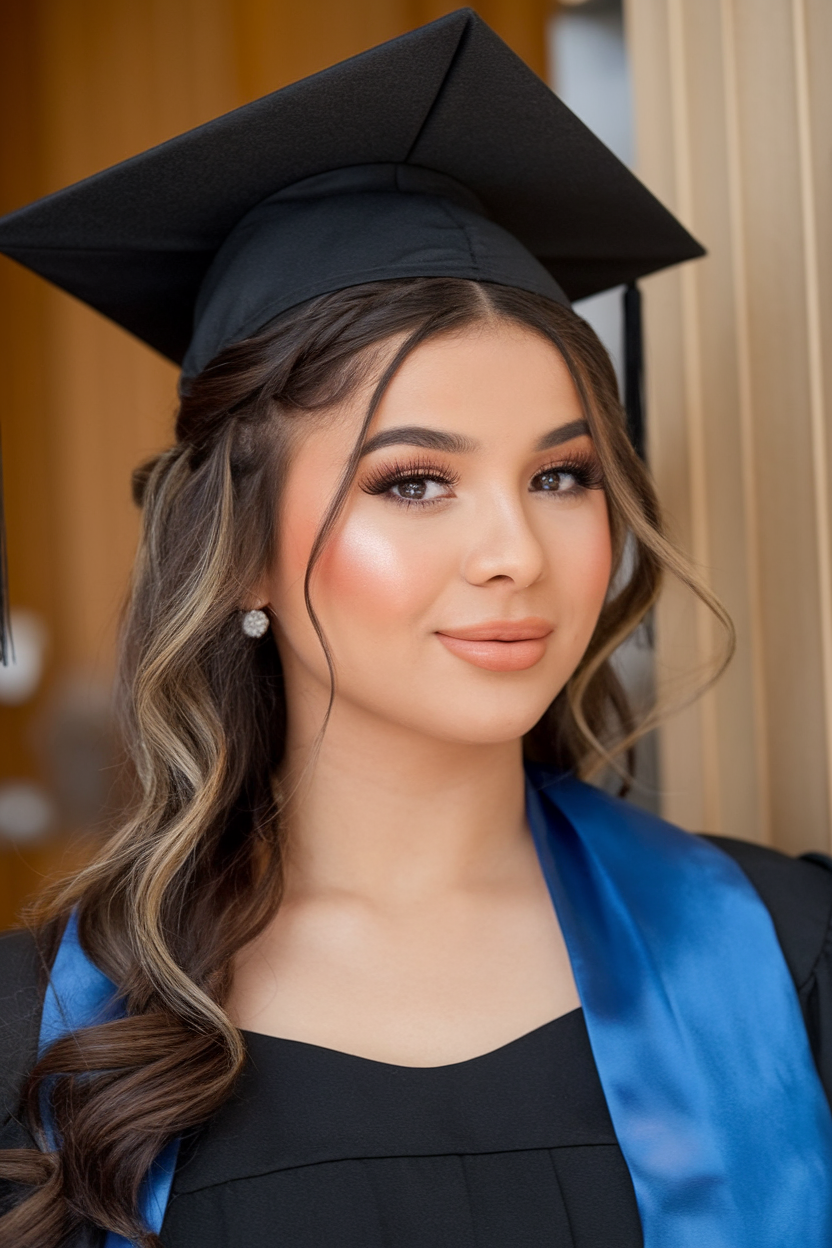 This graduation hairstyle with cap idea 2025 showcases long hair styled in soft, voluminous curls. The hair is parted slightly to the side, creating a flattering frame for the face, especially for those with a chubby face looking for a lengthening effect. The natural bounce of the curls adds a ball-ready glamour, making it perfect for both the ceremony and celebration afterward. This style remains secure under the cap while allowing for an elegant reveal once it’s removed.