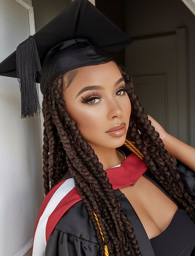 This graduation hairstyle with cap idea 2025 showcases long, thick braids styled into a structured and elegant look. The deep brunette shade enhances the texture, giving the braids a defined and sleek appearance. These side braids add a bold, stylish touch while remaining secure and practical for the ceremony. A perfect choice for those looking for a ball-ready, effortlessly chic style that transitions seamlessly from the graduation stage to celebrations.