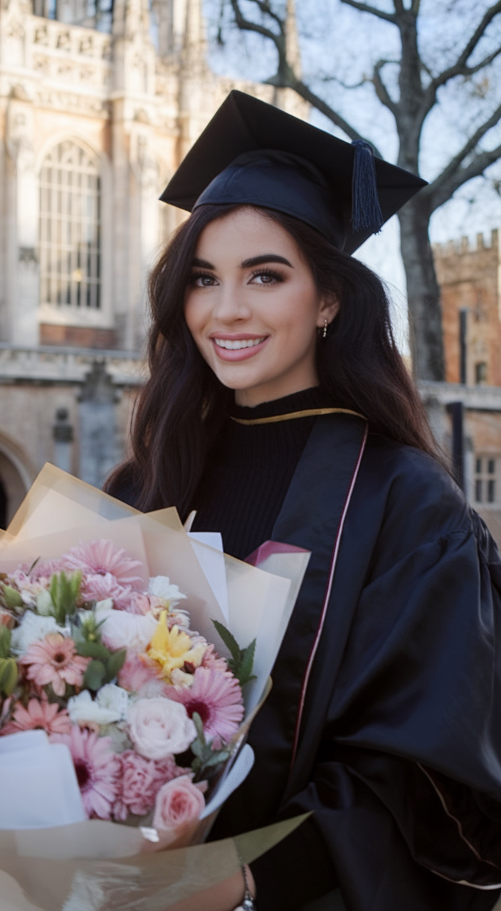 This graduation hairstyle with cap idea 2025 features a sleek low bun with a few loose strands framing the face. The dark brown shade enhances the sophisticated and polished look, making it a perfect choice for those wanting a refined style. The neatly gathered hair ensures that the graduation cap sits securely, while the soft tendrils add a touch of romance. This timeless hairstyle complements both high school and university graduates.