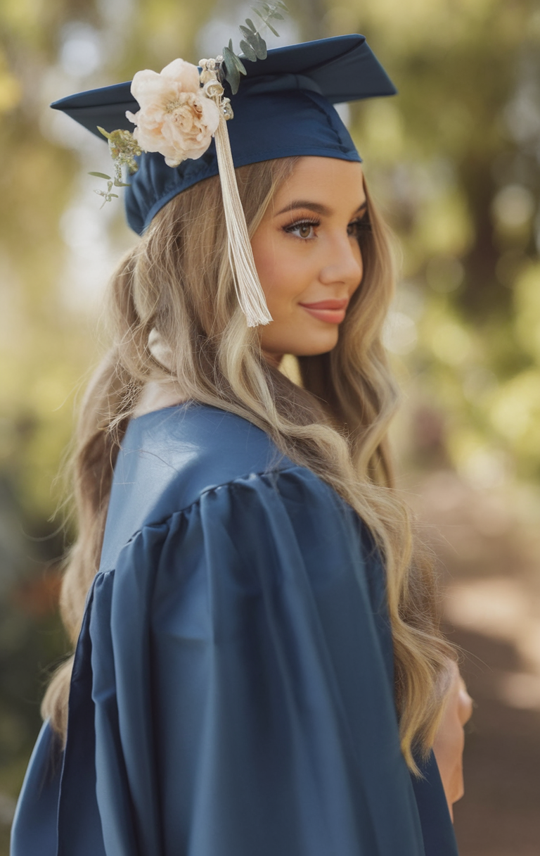 This hairstyle features long hair styled in loose, flowing waves that cascade effortlessly down the back. The soft blonde tones create a sun-kissed effect, adding warmth and dimension to the look. A delicate floral accent attached to the graduation cap enhances the romantic and pictorial feel of this style. The waves provide natural movement, making this a great option for an outdoor high school or college graduation.