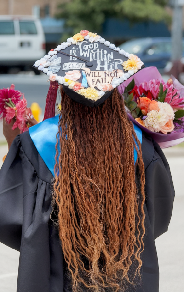 #25 Floral-Inspired Straight Hair with Graduation Cap
