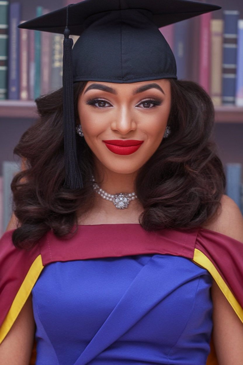 Here, the hair is styled in deep, side-swept waves, giving a sophisticated and picture-perfect effect. The black or deep brunette shade enhances the shine, making the curls appear smooth and glossy. This look is ideal for those who want a polished, timeless style that stays in place throughout the ceremony. The gentle curve of the waves adds movement without overpowering the structured elegance of the graduation cap.