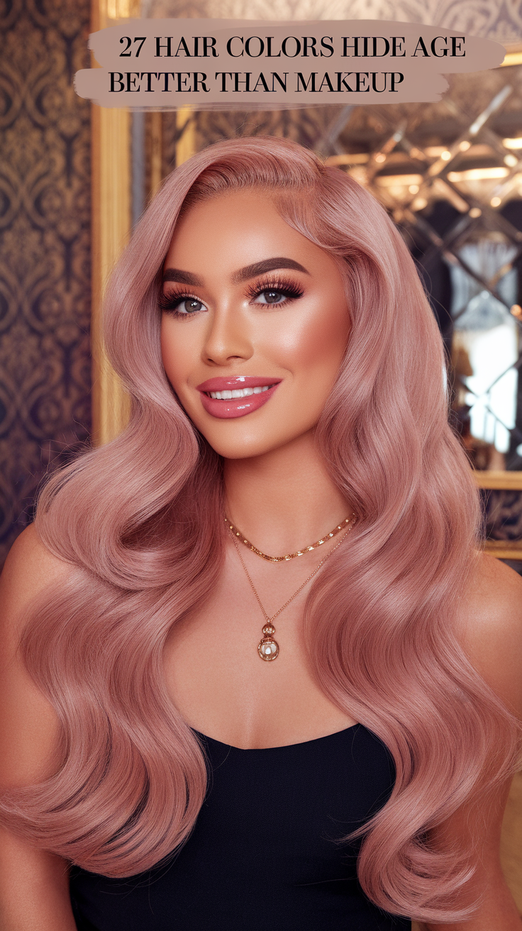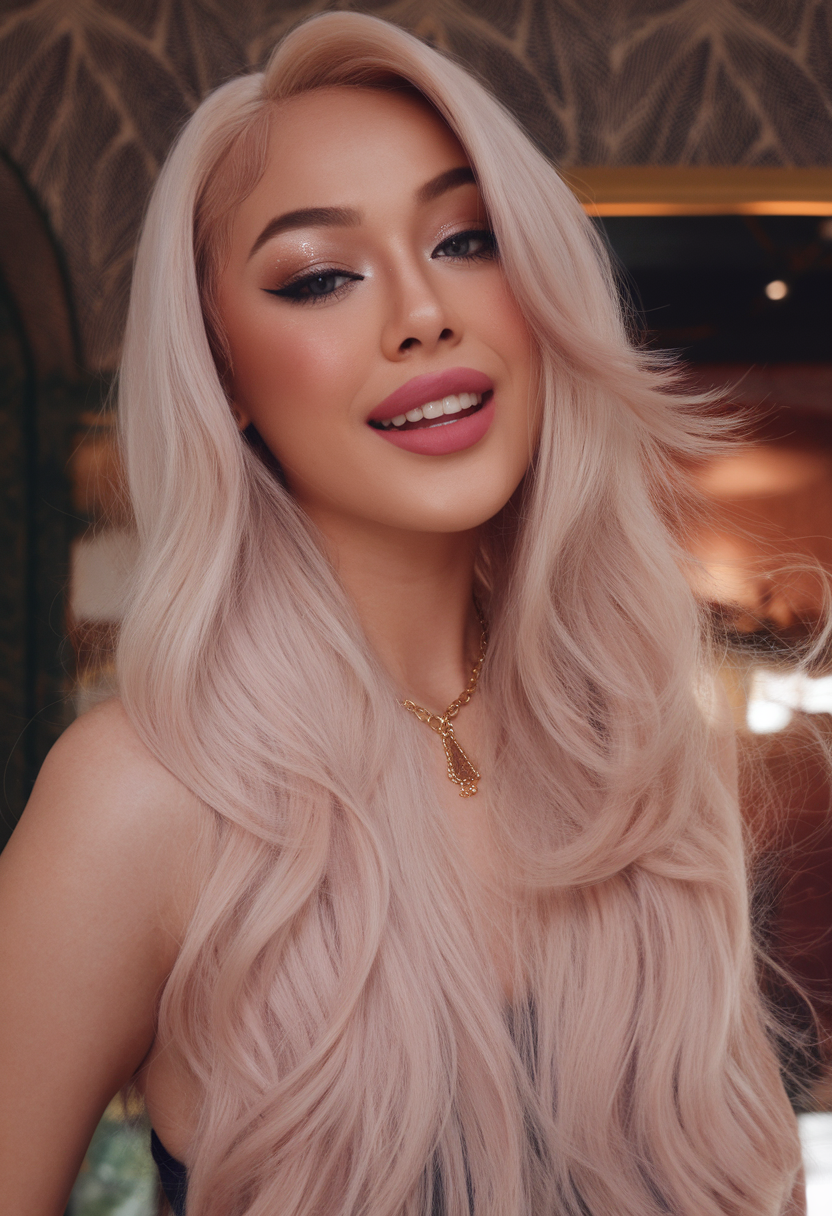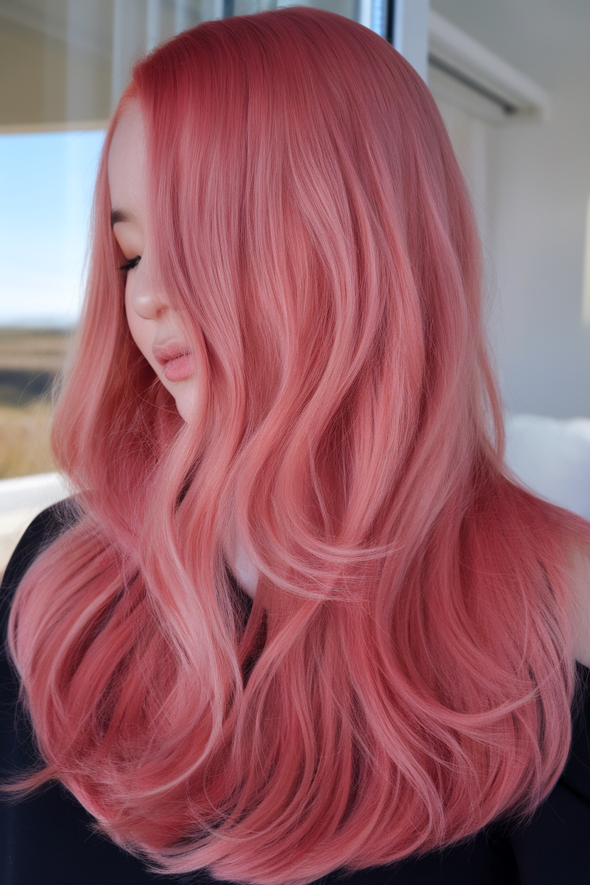This long rose gold hairstyle combines soft blonde and pink hues for a sophisticated yet playful effect. The loose, flowing waves add movement and volume, making the hair appear fuller and healthier. As part of hair trends 2025, this color is perfect for those looking to experiment while maintaining a natural glow. The balance of warm and cool tones makes it a flattering choice for various complexions.