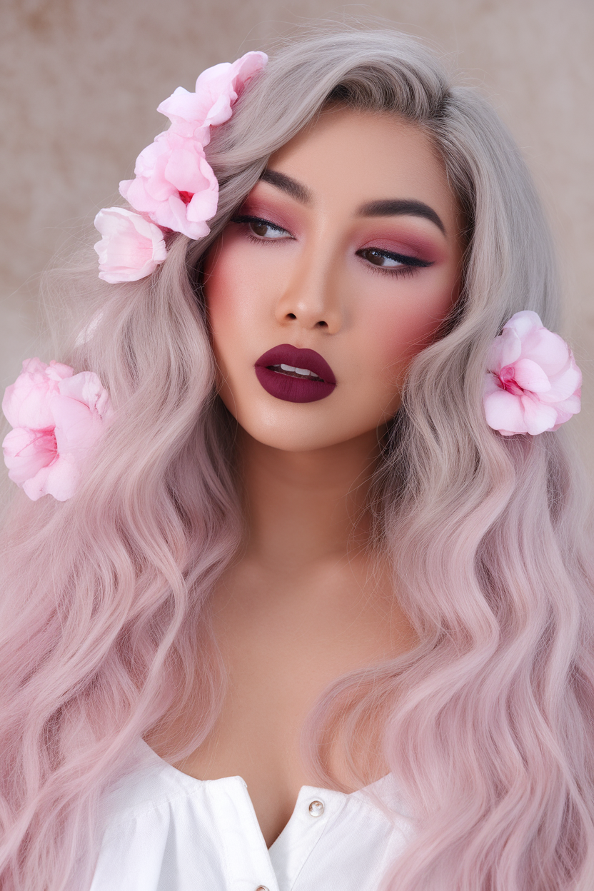 A silver-toned ash grey base blended with soft pastel pink creates an ethereal and sophisticated look. The long, wavy hairstyle enhances the classic elegance of the shade, making it a perfect choice for those embracing modern gray hues. This color is a great alternative for those who want a soft, European style that keeps their appearance fresh. A delicate grey hue like this reflects light beautifully, adding a youthful touch.