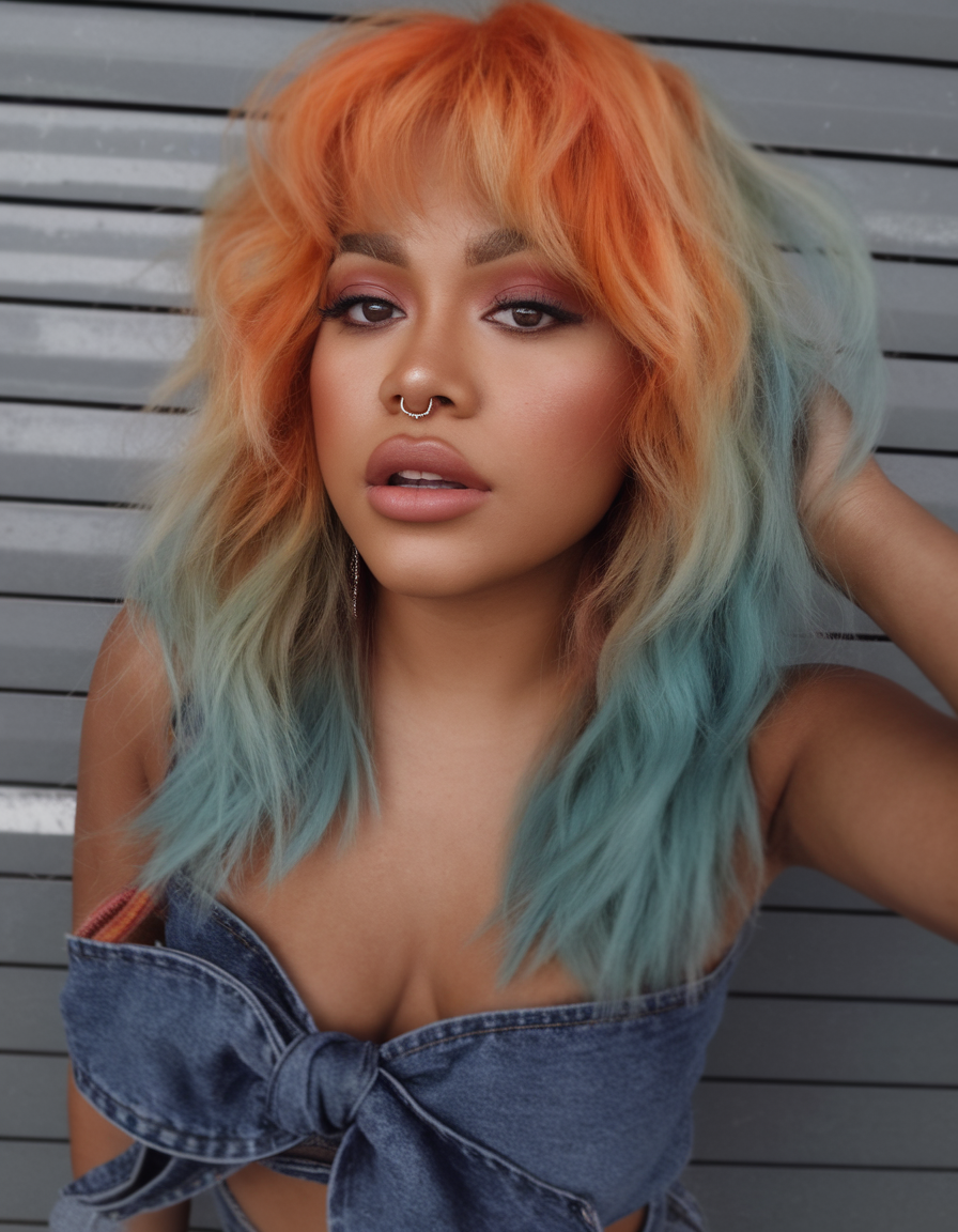 A fiery orange top fading into a soft blue ombre creates a striking contrast. The textured, shaggy cut gives this style a relaxed yet edgy feel, making it perfect for those who love bold transformations. This vibrant mix is a standout among 2025 hair colors, embodying creativity and self-expression. The modern layered shape adds volume while keeping the look youthful and dynamic.