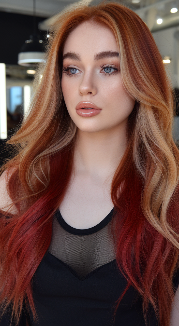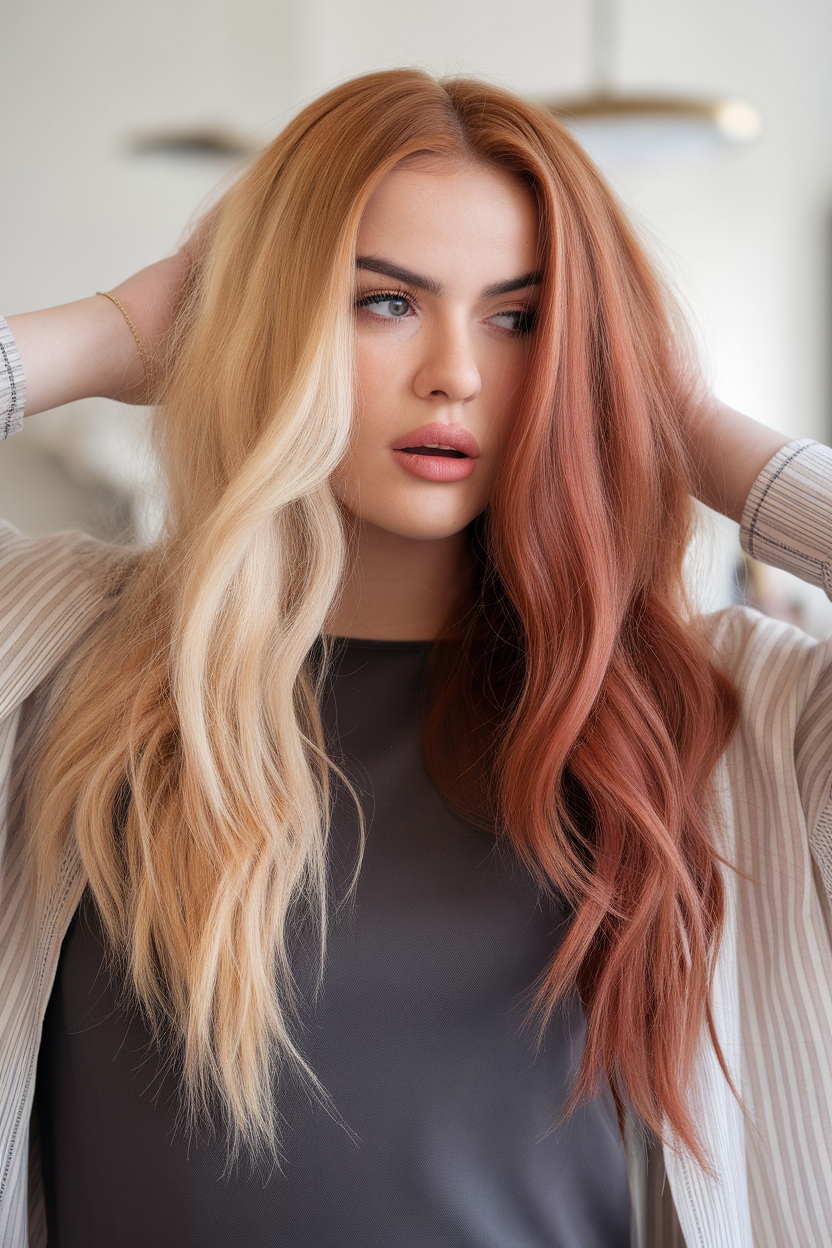 This unique half-and-half hairstyle blends classic blonde and rich ginger tones for a bold yet wearable statement. The long, wavy layers give movement and dimension, making the contrast blend seamlessly. As a top choice for 2025, this style offers a fresh perspective on dual-tone coloring. It’s a confident, modern take on 40 new color trends that suit various personalities.