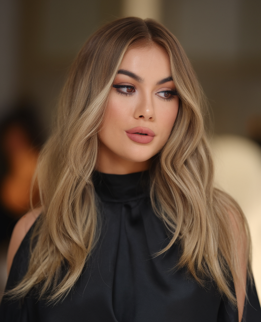 A brown base with subtle blonde highlights creates a multidimensional effect that brightens the complexion. The long, soft waves add a romantic and feminine touch, perfect for a European style. This shade blends seamlessly with natural hair growth, making it a low-maintenance yet stylish choice for 2025 hair colors. It’s a refined look that works effortlessly in both casual and corporate settings.