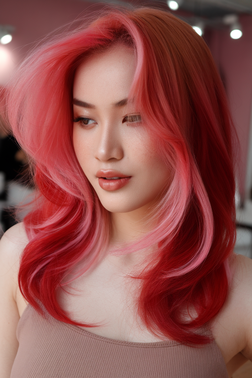 A bold red base with soft pink accents gives this layered hairstyle a playful and dynamic feel. The voluminous, feathered layers enhance movement, making it a standout among 2025 hair colors. This mix of warm and cool tones works well for those looking to add vibrancy to their look. The European influence in the cut keeps it fresh and trendy.