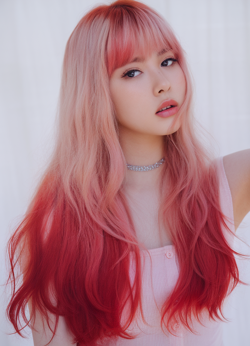 A peachy pink base transitioning into a bold red ombre gives this hairstyle a vibrant yet soft effect. The long, layered cut enhances movement and keeps the look youthful. The blunt bangs add a touch of Korean influence, making it one of the top 2025 hair colors for those who love warm tones. This gradient blend creates dimension while keeping the style fresh and modern.