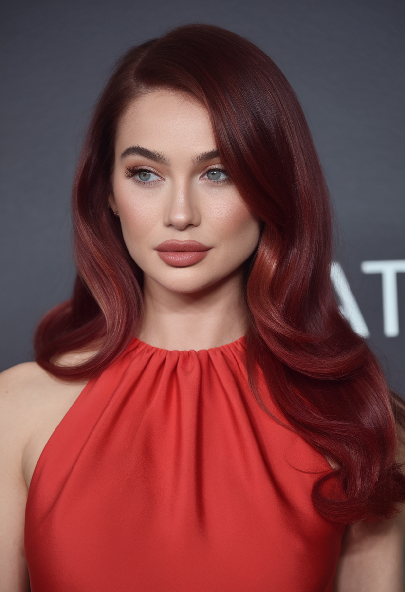 A deep red shade with a glossy, voluminous finish embodies a timeless and classic appeal. The sleek waves add sophistication, making this an ideal option for corporate and evening looks. As a top trend in 2025, this color enhances facial features by adding warmth and radiance. The dark undertones ensure depth, making it a flattering choice for various skin tones.