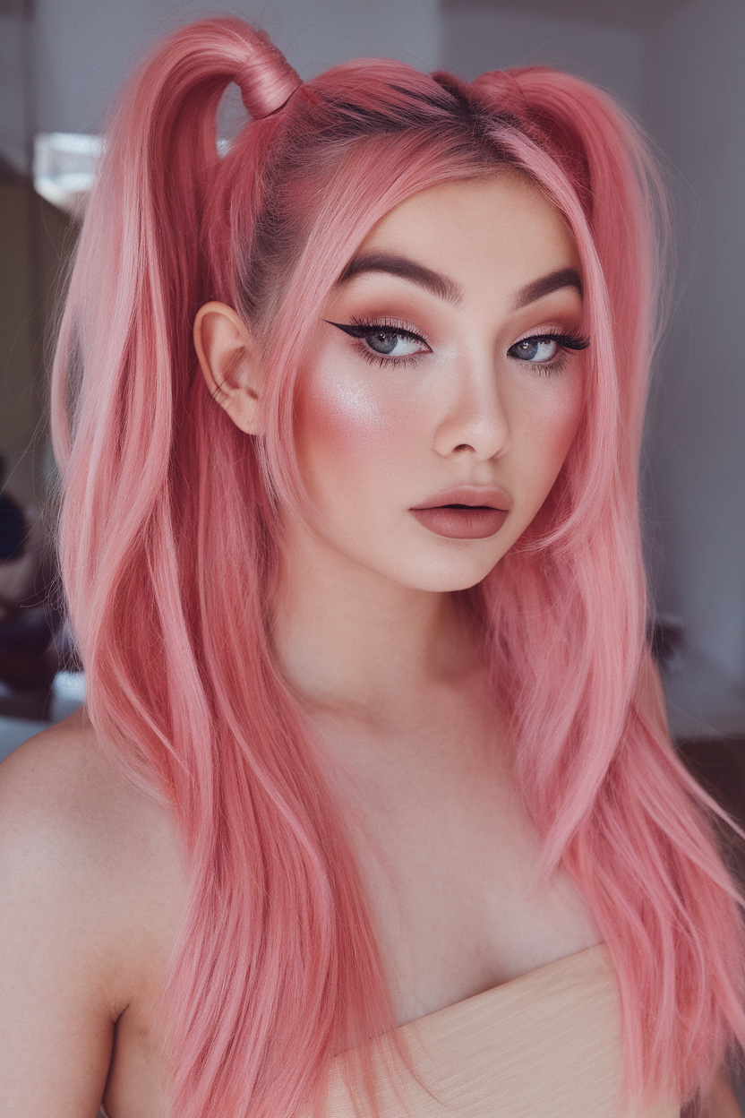 This pastel pink hairstyle features high ponytails, giving it a playful and youthful edge. The long, sleek layers add length and volume, making it an ideal 2025 hair color for those wanting a fun yet stylish look. The warm pink shade complements different complexions, bringing a modern twist to blonde alternatives. This is a great statement style for those looking to experiment with bold yet soft hues.
