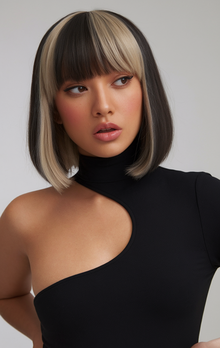 A striking black and platinum blonde bob with blunt bangs delivers a bold and structured appearance. The short, sleek cut follows a precise shape, creating a modern and European-inspired edge. As a standout among hair trends 2025, this dual-tone effect enhances facial contours. The blend of dark and light creates an effortless contrast that remains stylish and fresh.