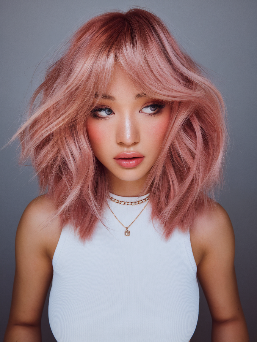 A modern rose gold bob with choppy layers creates a playful and voluminous effect. The textured finish adds body, making the style appear full and youthful. As part of 2025 hair trends, this blend of pink and blonde tones provides a fresh take on contemporary colors. The light-reflecting hues add vibrancy, making this a standout choice for those looking to brighten their appearance.