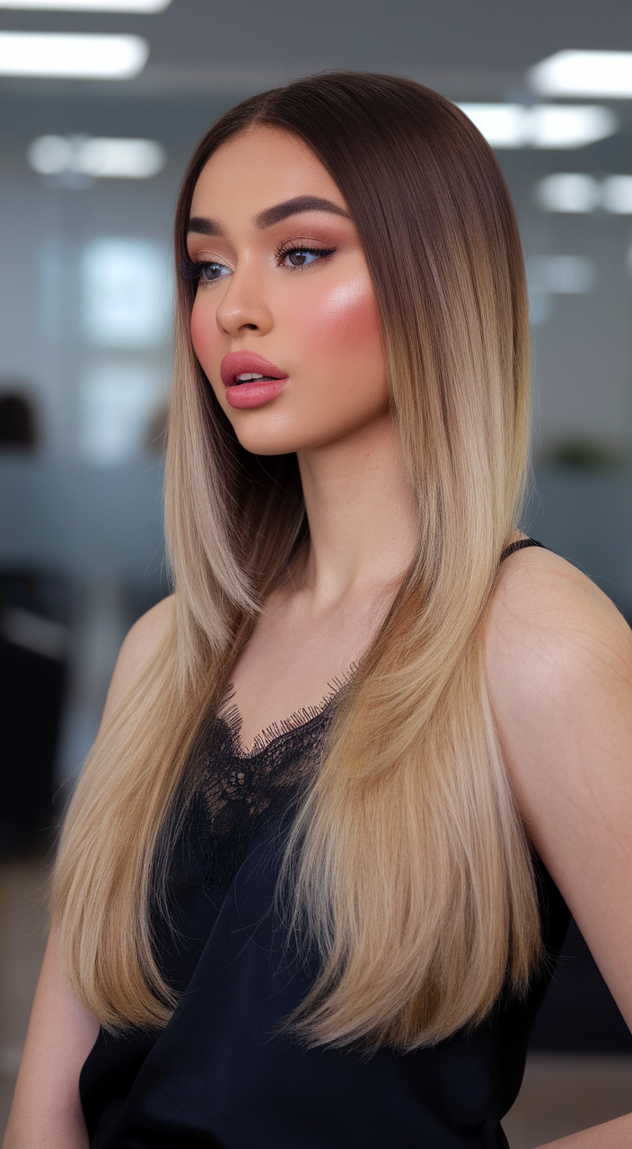 A dark brown root melt blending into cool blonde ends creates a stunning ombre effect. The long, straight layers give this hairstyle a sleek and refined look. This 2025 hair color is a top choice for those who want contrast while maintaining a natural transition. The gradual fade makes it a low-maintenance yet stylish option for all ages.