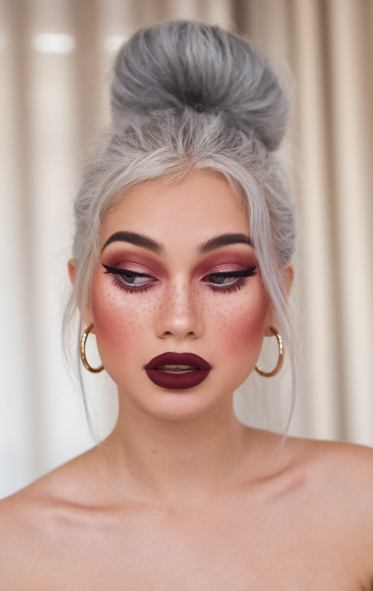A sleek ash grey tone combined with a high bun creates an elegant and youthful style. This silver-gray shade is one of the best ideas for embracing modern gray hair while maintaining a fresh, sophisticated look. The soft European influence in the styling adds a chic and polished finish. This 40’s-friendly shade reflects light beautifully, making it an excellent alternative to traditional blondes.