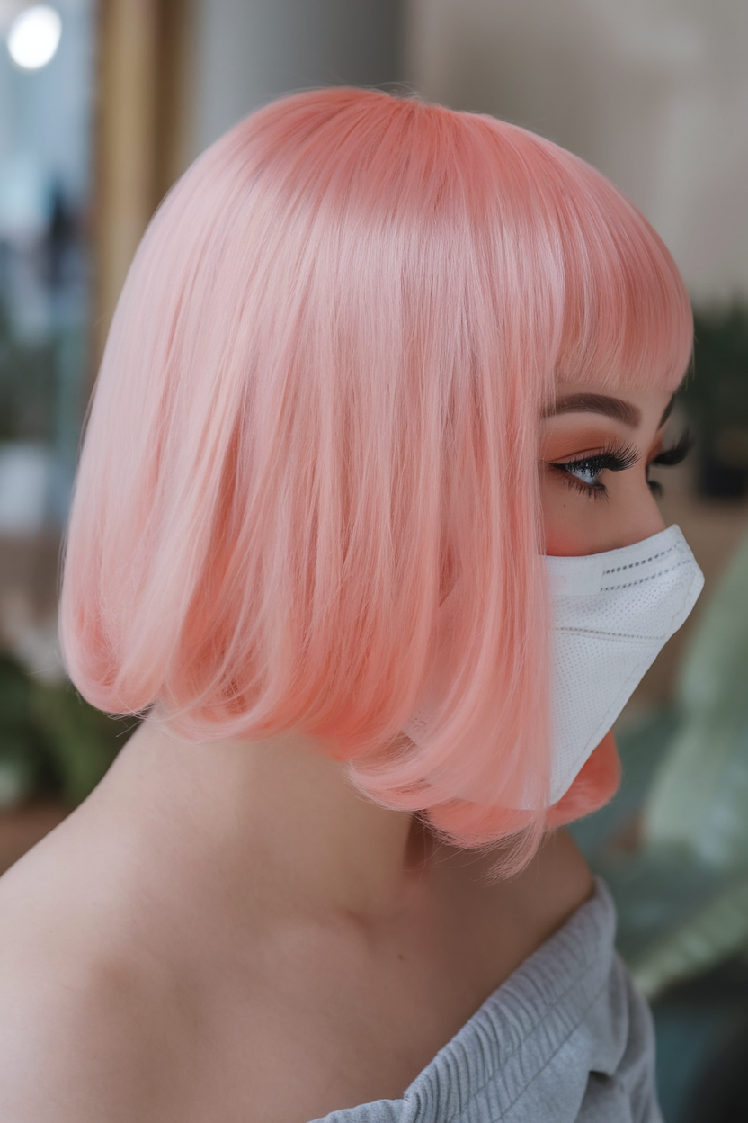 A short pastel pink bob is a fresh take on modern 2025 hair colors. The smooth, sleek cut adds a youthful softness, while the blunt bangs create a structured yet playful look. This shade works well for those who want a stylish alternative to classic blonde or ash grey tones. The light, airy color reflects beautifully, making it a trendy choice for any season.