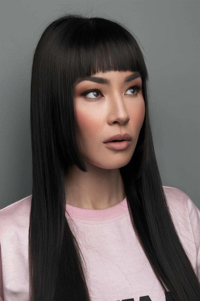 Sleek Black Hair with Blunt Bangs