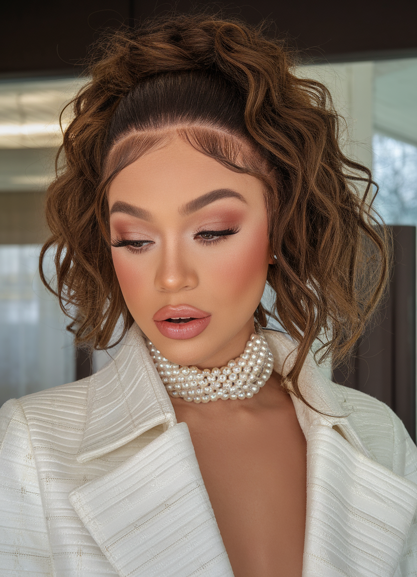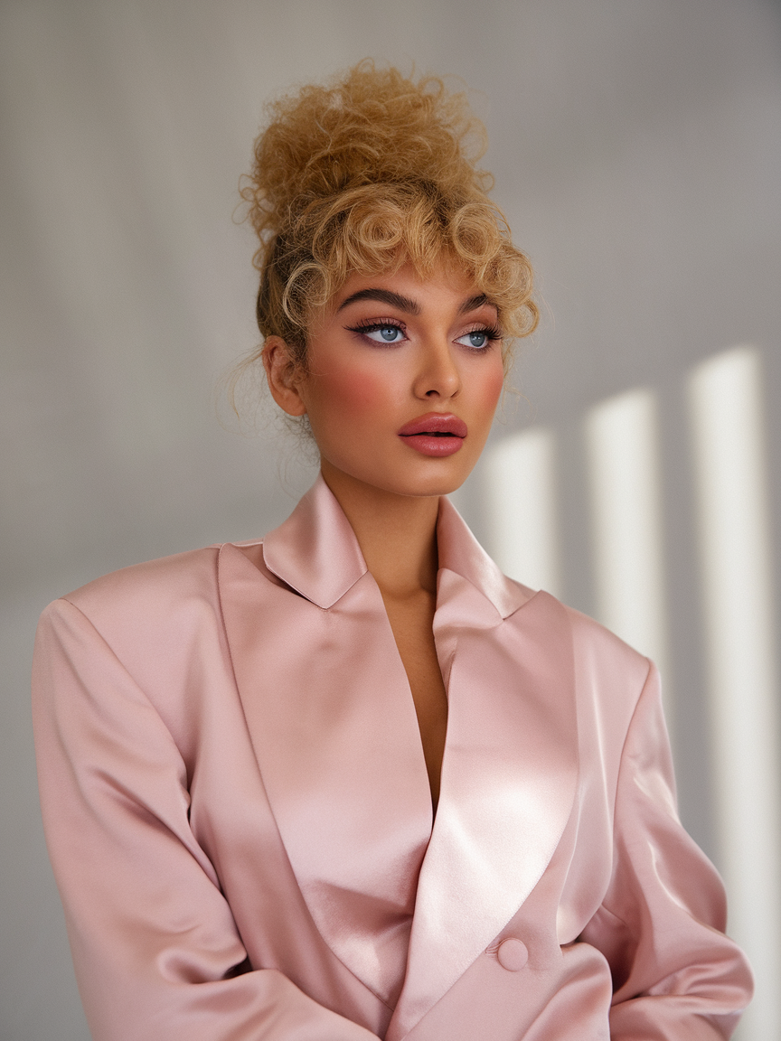 This short curly updo adds volume and bounce, making it a perfect choice for those who want to appear fresher and more vibrant. The loose curls create a romantic yet modern touch, while the clean baby hairs around the hairline soften facial features. Ideal for an oblong face, this style blends 70s elegance with a modern twist. A well-executed updo like this lifts the face and enhances youthful energy.