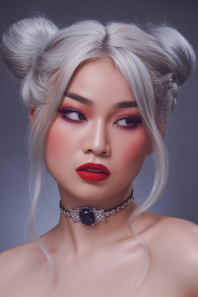 This futuristic hairstyle merges Japan-inspired trends with a playful yet edgy look. The icy silver shade adds a bold statement, while the loosely curled tendrils frame the face delicately. The slickback bun placement gives a structured effect, lifting the face and making the hairstyle appear modern. This look is a great way to blend Kdrama aesthetics with easy viking boldness.