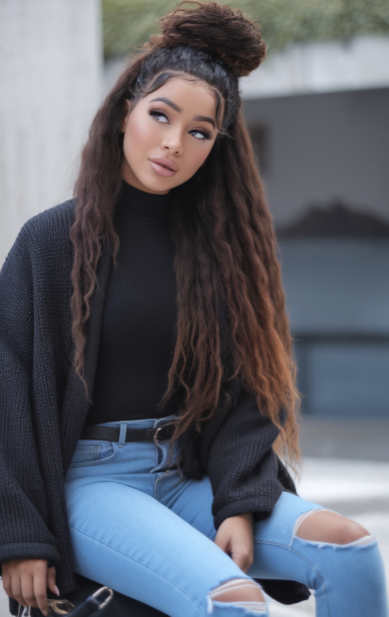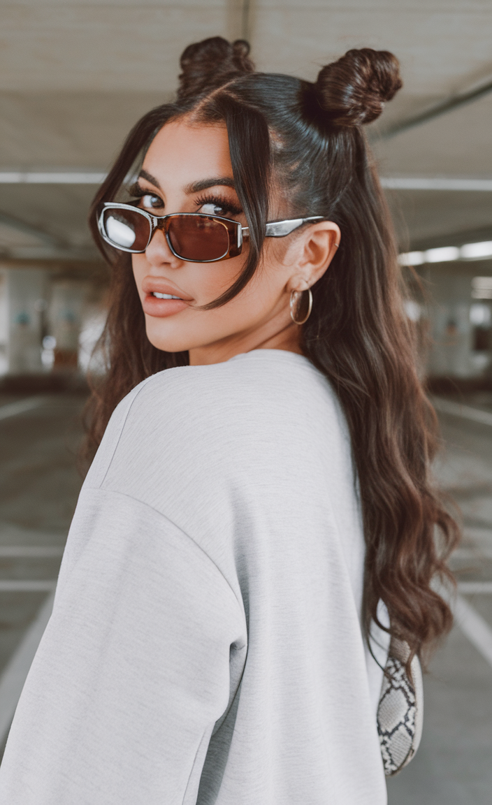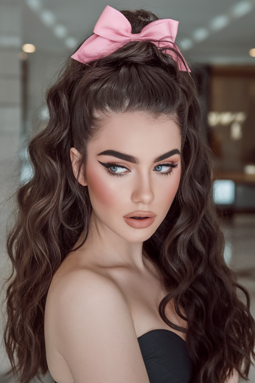 This long hairstyle brings 80s nostalgia with a fresh, modern twist. The sleek half-up buns add volume and lift at the crown, while the cascading waves create movement. The deep brown shade keeps the look natural and versatile, making it an easy way to achieve a youthful, effortless style. Perfect for those who want a playful yet polished everyday look.