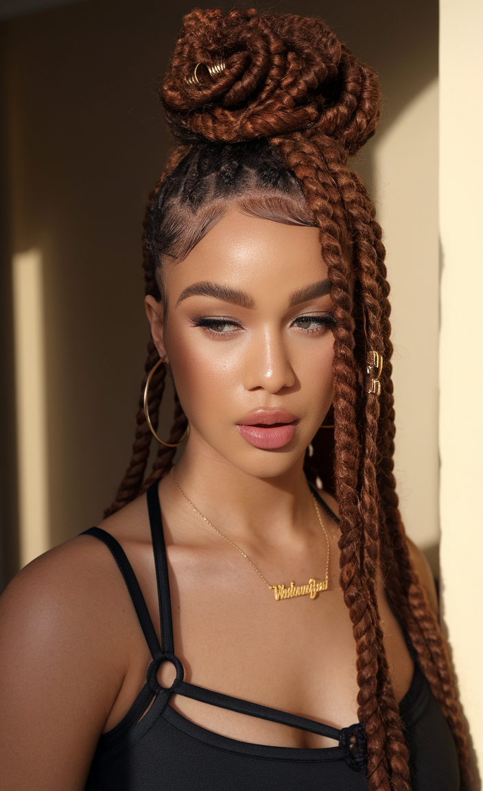 This short natural updo is a bold and elegant choice that combines structure with texture. The slickback effect at the roots ensures a clean finish, while the twisted locs create volume and dimension. The warm brown hue adds richness, making the hair look vibrant and healthy. This is a great corporate yet stylish option that balances tradition with modern edge.
