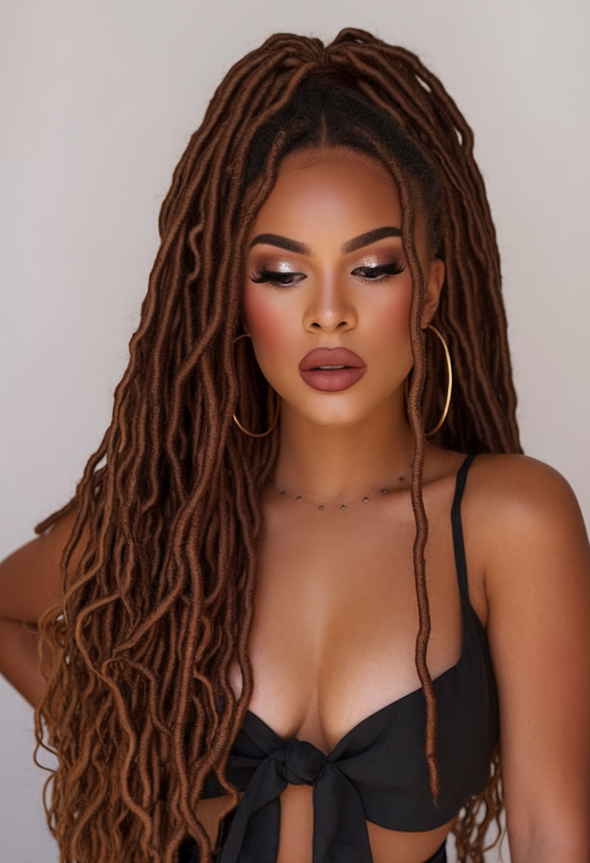 This long hairstyle blends Nordic and Italian influences with a beautifully sculpted high ponytail. The thick, textured locs create volume, while the rich brown shade enhances depth and warmth. A face-framing strand adds softness, keeping the look dynamic and flattering. This is an ideal style for those who want to make older hair appear youthful and full of life.