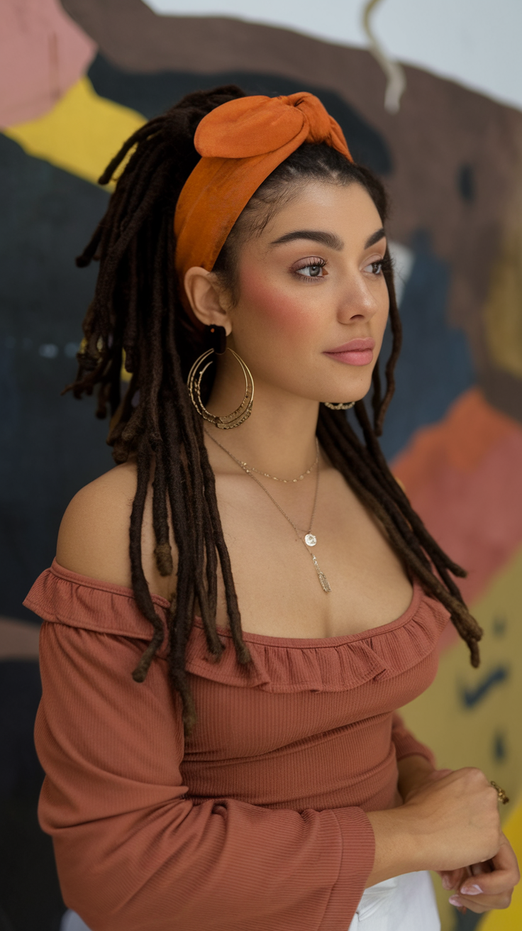 This short natural style combines relaxed dreadlocks with a soft, structured half-up look. The headband adds a touch of playfulness while keeping the style clean and well-framed. The warm brown tone of the locs enhances the face’s natural glow, making it a great choice to make older hair appear youthful and fresh. This look effortlessly balances casual and chic aesthetics.