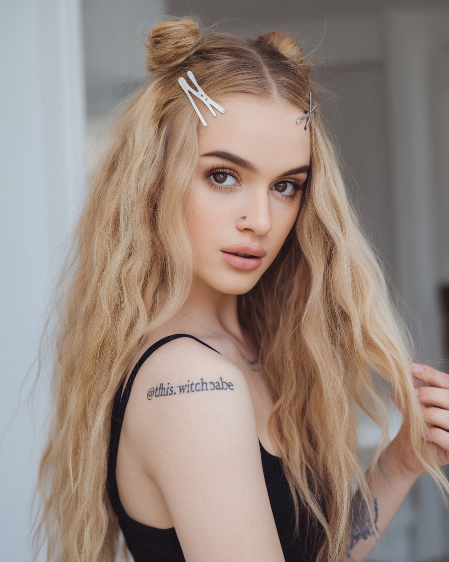 This medium hairstyle blends 80s and Kdrama influences, featuring small buns for a youthful lift. The long, flowing waves create volume and movement, while metallic clips add a modern touch. The golden blonde hue brightens the overall look, making it an excellent way to achieve a futuristic yet effortless effect. This is a fun and versatile option that enhances a youthful glow.