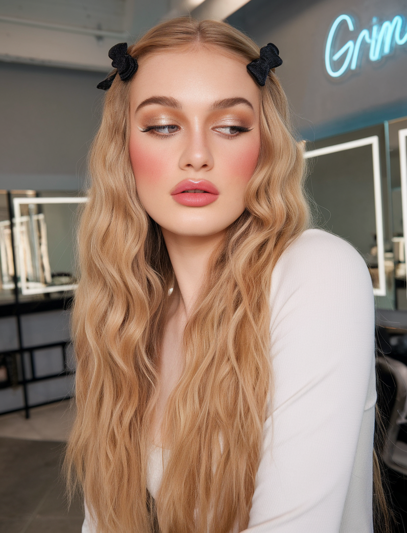 This long hairstyle is inspired by Italian elegance, featuring soft, natural waves that add body and movement. The small black bow clips provide a refined touch while keeping the look fresh and light. The warm honey-blonde shade brings out facial brightness, helping to make older hair appear vibrant. This is a simple yet effective way to achieve timeless beauty with a modern touch.