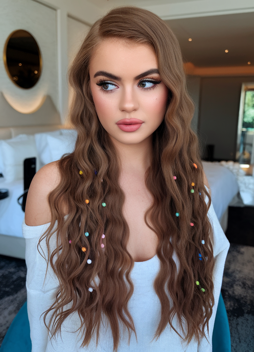 This long hairstyle brings a subtle Nordic vibe with its textured, mermaid-like waves and delicate beaded details. The natural brunette color gives depth, while the loose waves add effortless volume and movement. The colorful beads add a playful, youthful element, perfect for making the hair appear full of life. This look is ideal for those who want a clean yet bohemian style that enhances their natural beauty.