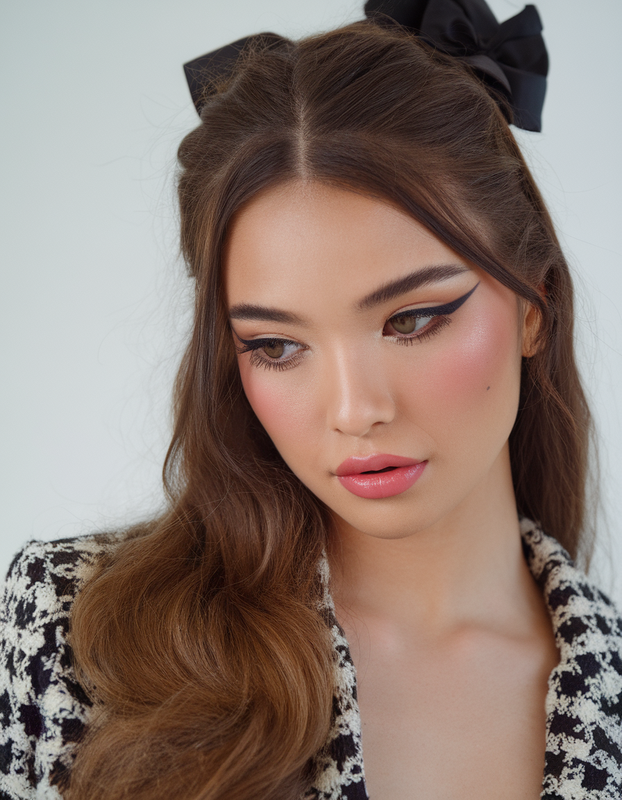 This long hairstyle is a timeless look inspired by Italian elegance. The soft waves add volume and movement, while the black bow accent gives a youthful and polished touch. The warm brunette shade enhances natural depth, making it a great choice to make older hair appear refreshed. This style is perfect for a sophisticated yet playful appearance.
