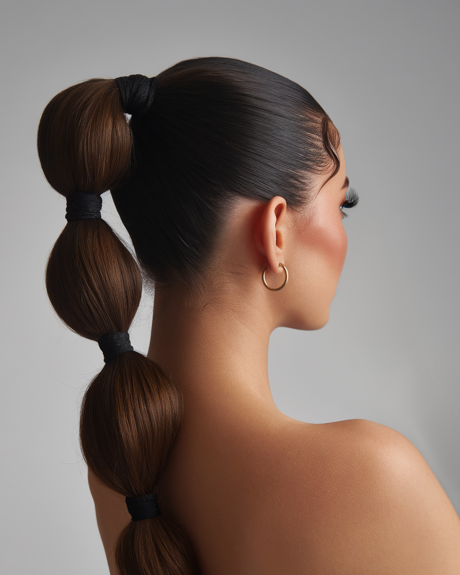 This slickback ponytail is a bold, futuristic take on a classic high ponytail. The evenly spaced sections create a structured yet voluminous effect, while the deep brown tone keeps it refined. The sleek base lifts the face, making this a great option for those looking to achieve a sharp yet stylish look. This hairstyle blends corporate chic with modern versatility.