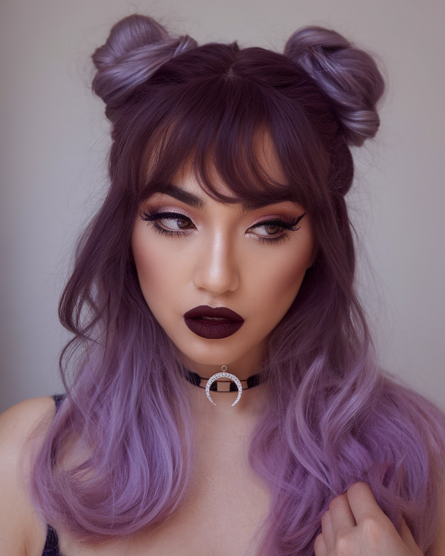 This short wavy hairstyle is a futuristic and edgy take on a playful look. The two twisted buns add height and volume, while the soft waves give movement. The gradient lavender hue creates a bold statement, making it a great way to add vibrancy and energy to the hair. This look embraces Japan-inspired trends while keeping the styling soft and flattering.