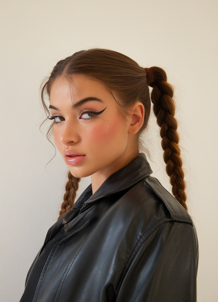 This medium hairstyle brings a playful yet polished effect, inspired by Kdrama aesthetics. The neatly parted braids provide a structured yet soft frame, making them ideal for an oblong face. The sleekness at the roots adds a clean and youthful finish, preventing the look from feeling too old or outdated. This style is a modern take on 70s and 80s influences, refreshed for today’s trends.