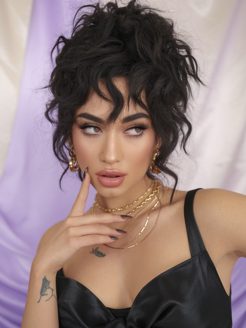 This short curly hairstyle adds effortless elegance with its tousled texture and wispy face-framing bangs. The controlled volume at the crown gives a subtle soft mullet effect, elongating the face while keeping the style clean and fresh. Inspired by Italian and Kdrama aesthetics, this updo is ideal for those who want to make older hair appear more youthful. The undone curls give a natural yet sophisticated look.