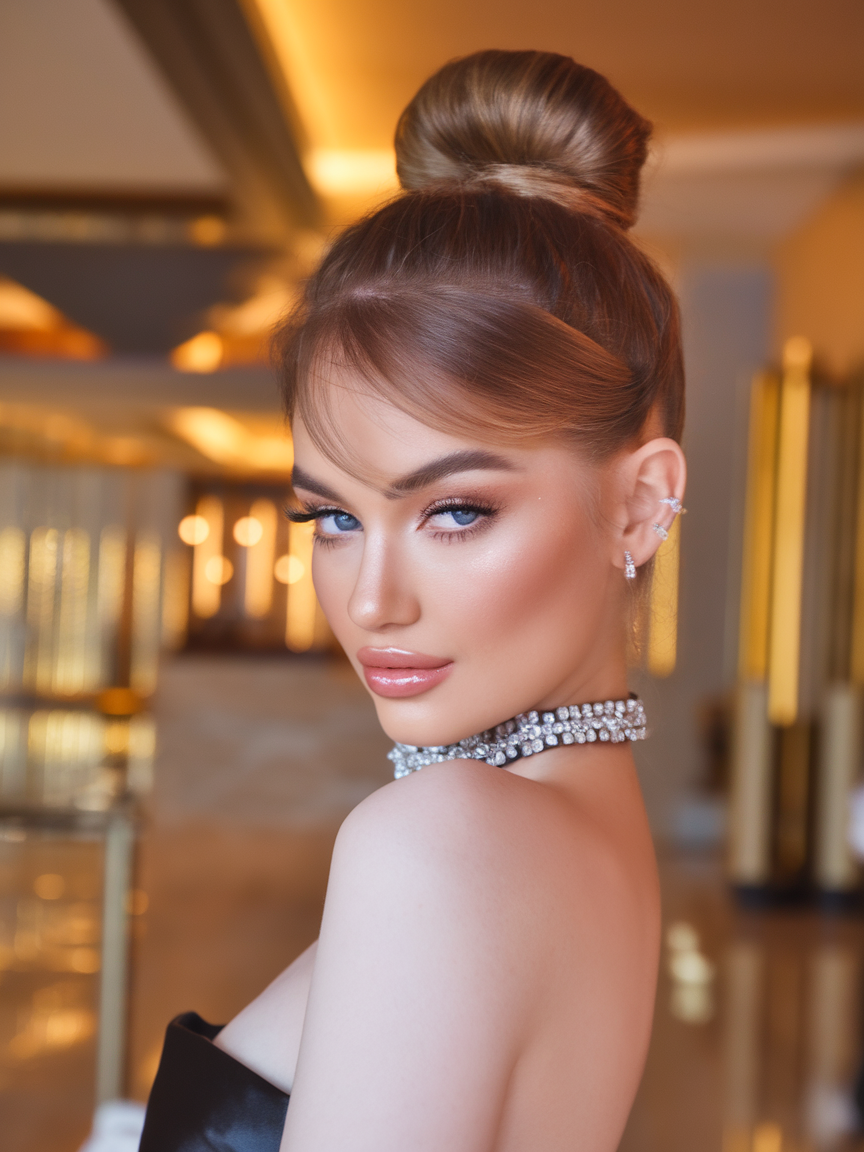 This classic high bun is the epitome of elegant simplicity. The smooth, pulled-back hair creates a clean and polished appearance, while the soft, side-swept bangs add a classy touch. This look is ideal for those who appreciate a fancy yet effortless style that works for both formal and casual occasions. The glossy finish enhances the old money aesthetic, making it a go-to for a refined look.