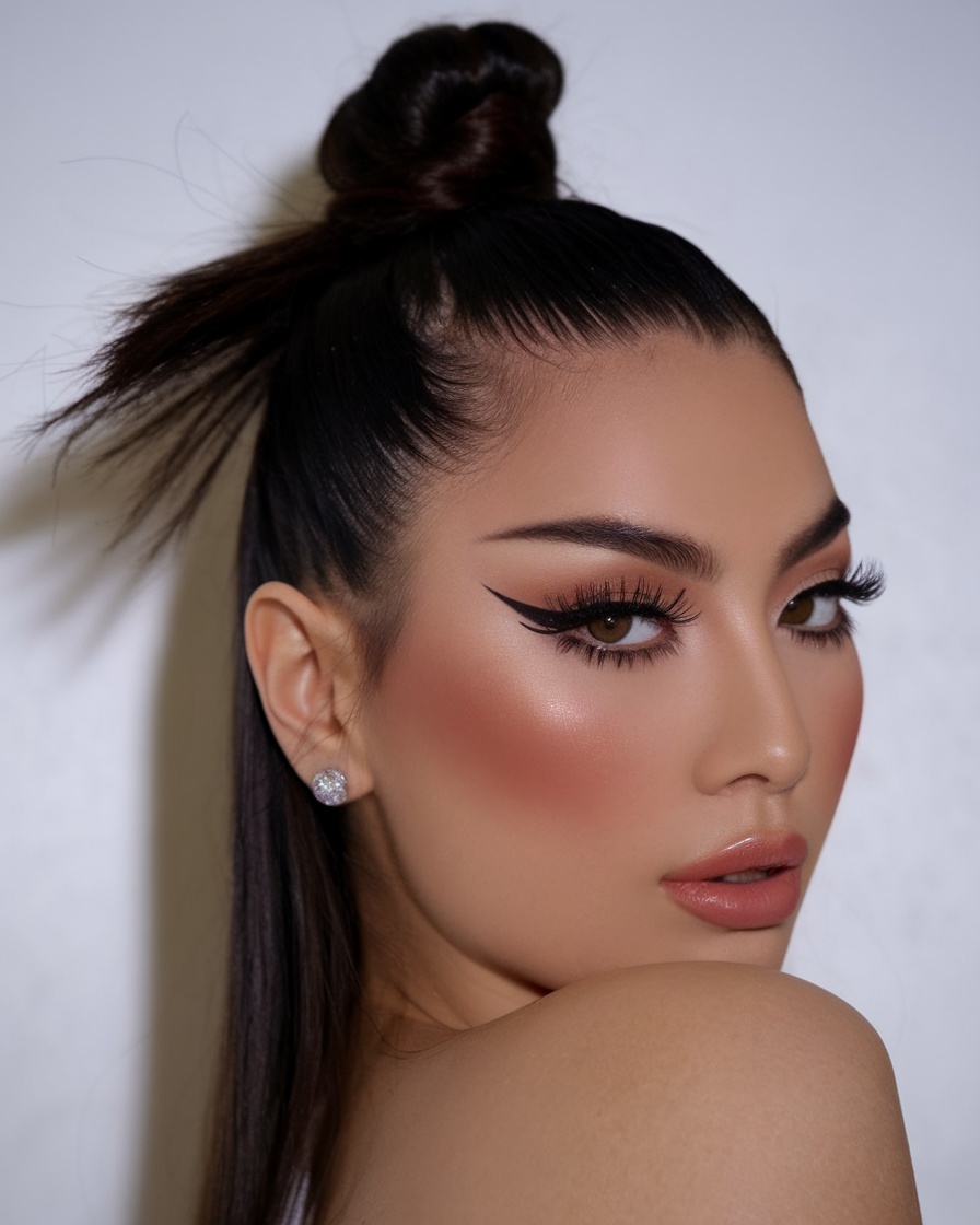 #29 Sleek High Bun with Face-Framing Bangs