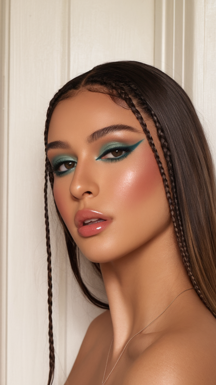 This modern hairstyle features glossy, straight locks with two delicate face-framing braids that add a trendy, bohemian touch. The deep brunette shade enhances the luxurious appeal, making the hair look effortlessly polished. The contrast between the sleek strands and the intricate braids creates a balanced and chic aesthetic. This style is perfect for those seeking a refined yet playful look.
