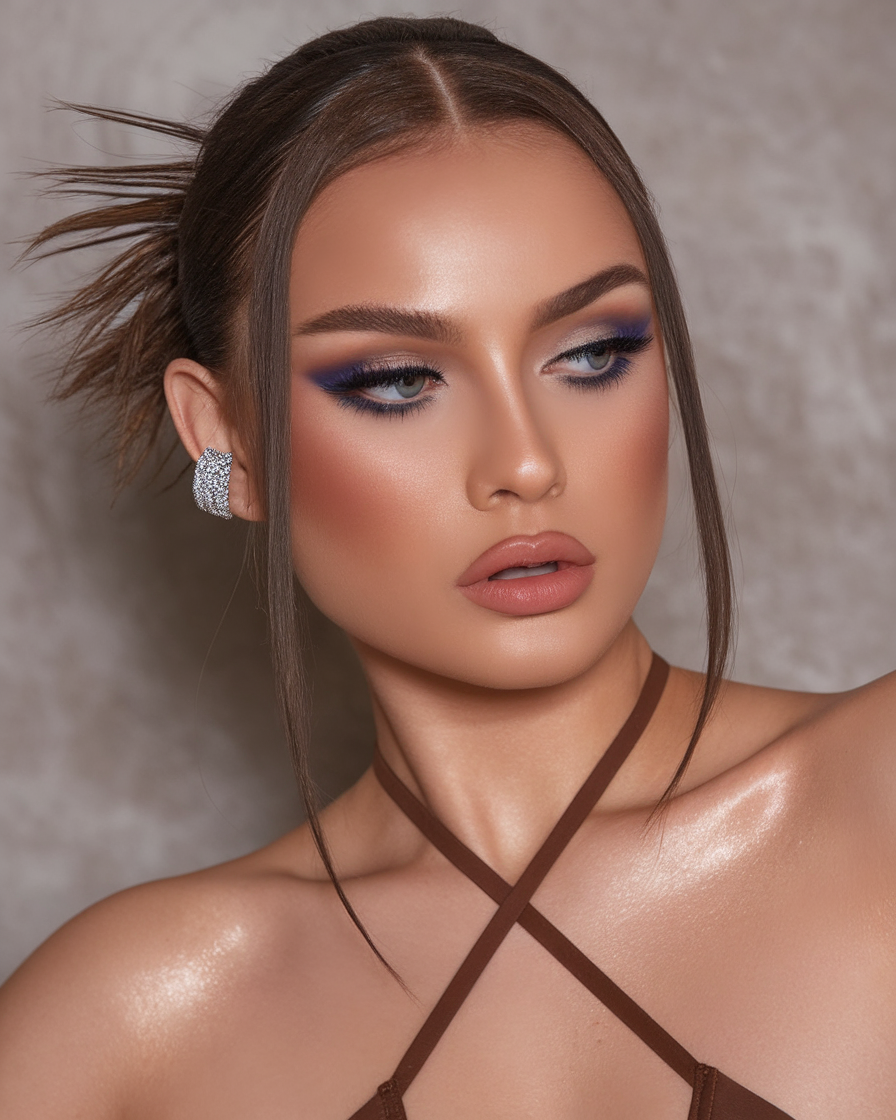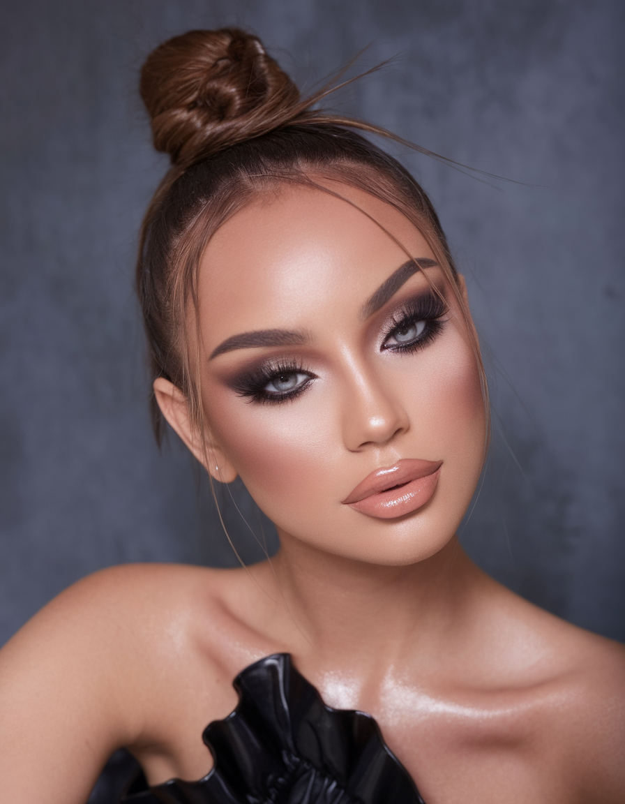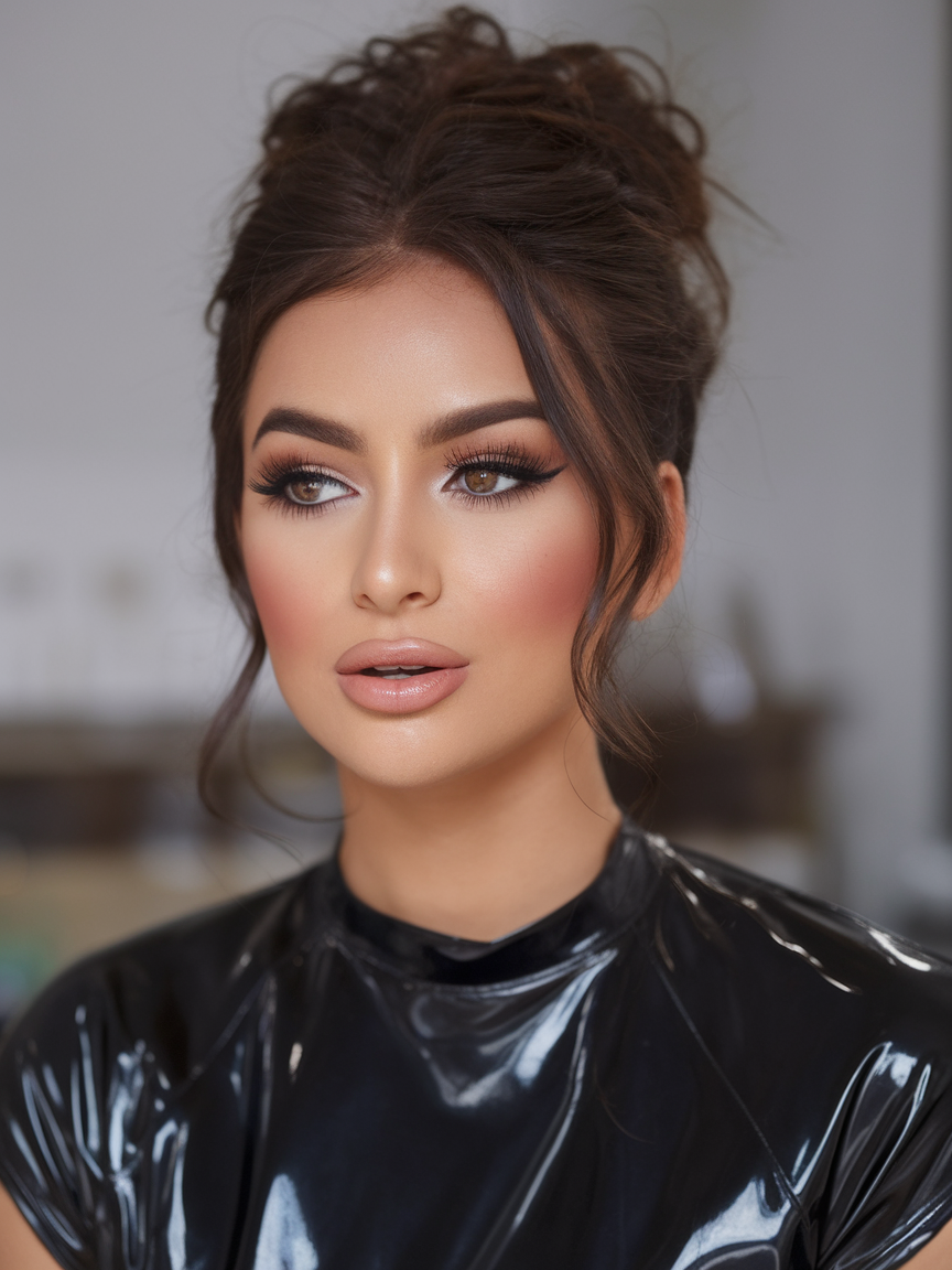 A relaxed yet polished messy bun adds a chic and effortless touch to this look. The rich brown shade enhances the hair’s depth, giving it a glossy and expensive appearance. Soft, wispy strands frame the face delicately, balancing the structured yet undone vibe of the bun. This hairstyle is perfect for those who want to achieve a modern, refined, and slightly romantic look.