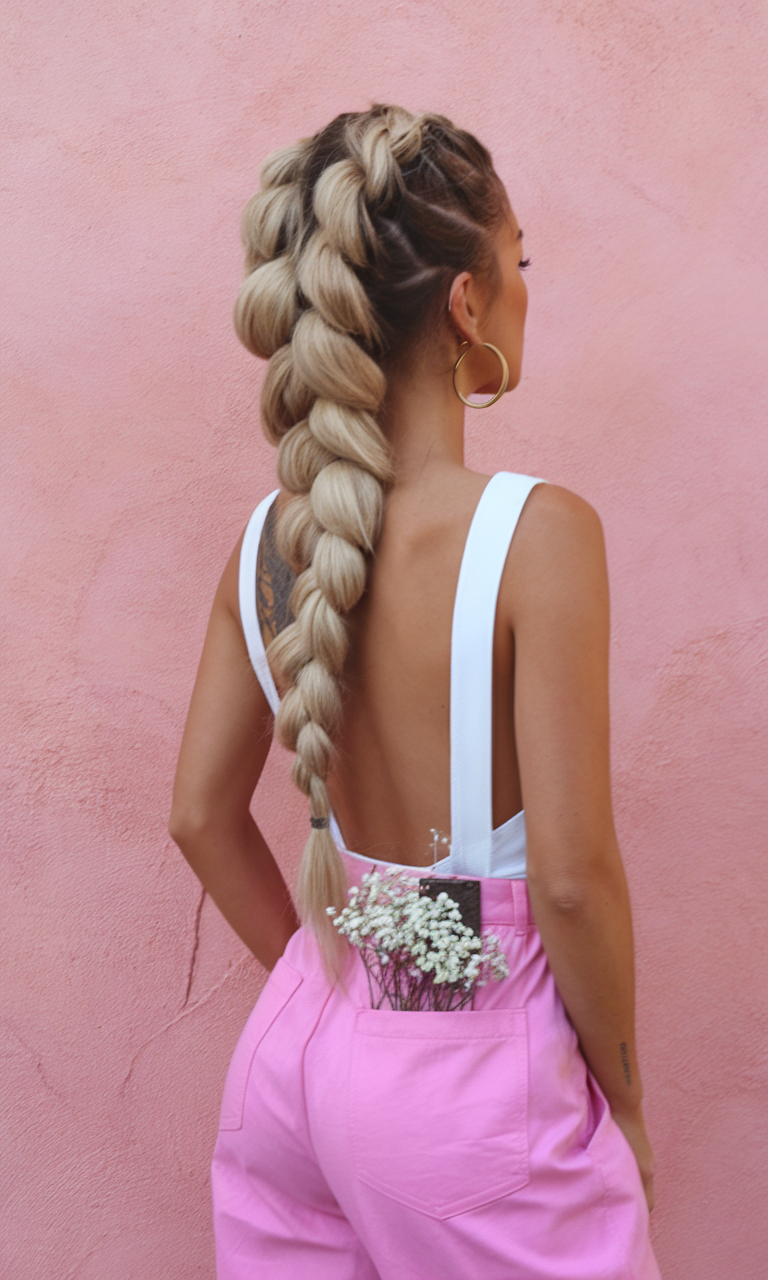This bold and intricate hairstyle features thick, voluminous Dutch braids cascading down the back. The multi-tonal blonde hues add depth, enhancing the dimensional effect of the braids. The lifted roots and oversized sections create a trendy, statement-making look with a sporty yet glamorous feel. This style is perfect for those who want a dynamic and high-fashion braided look.