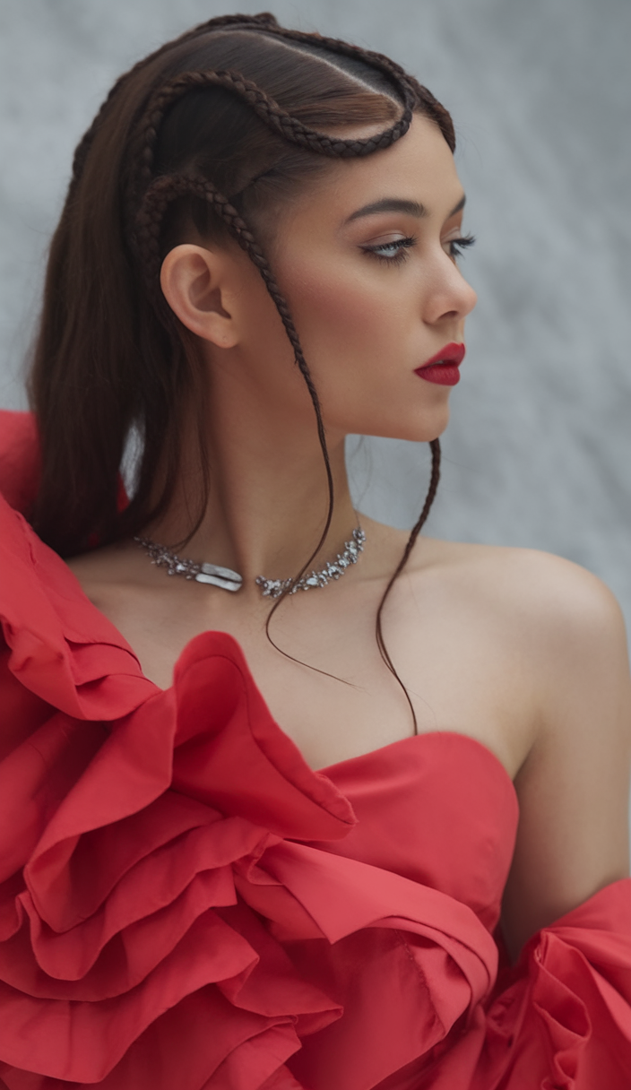 This innovative braided style features curved sculptural braids framing the face, creating a high-fashion statement. The deep brown hair color adds contrast, making the intricate weaving stand out. Delicate loose strands soften the boldness of the look, maintaining a balanced and artistic aesthetic. This style is for those who appreciate creative, edgy, and meticulously crafted hairstyles.