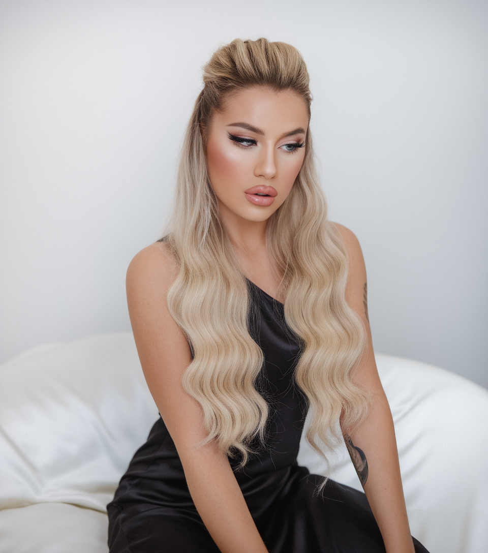 This half-up, half-down hairstyle blends volume at the crown with soft, cascading waves for an effortlessly polished look. The cool blonde shade with darker roots creates depth, making the style look full and dimensional. The lifted front section adds a glamorous touch, framing the face beautifully. This hairstyle embodies classic elegance with a modern edge.