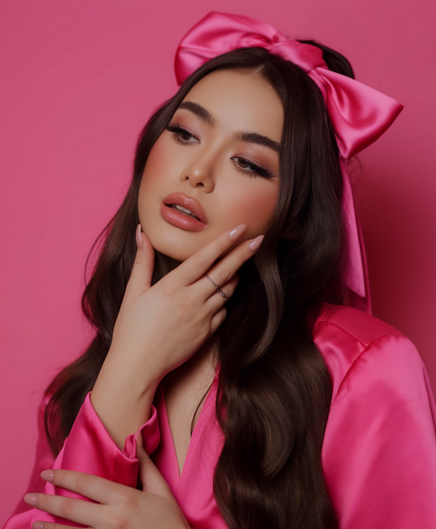 This soft and elegant hairstyle features long, flowing waves that add volume and movement. The rich brunette shade enhances the natural shine, making the hair look healthy and luxurious. A large satin bow adds a playful yet refined touch, elevating the style with a chic and feminine flair. This hairstyle is perfect for those who love a delicate yet sophisticated look.
