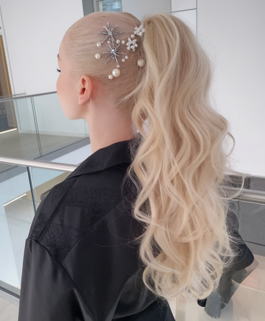 This polished high ponytail is styled with soft curls cascading down the back, creating an effortlessly luxurious appearance. The icy blonde tone enhances the glossy and voluminous effect of the hair. Pearl and star embellishments on the sleek crown add a decorative and glamorous touch, making this style perfect for a modern, regal aesthetic. This look is the ultimate blend of elegance and contemporary chic.