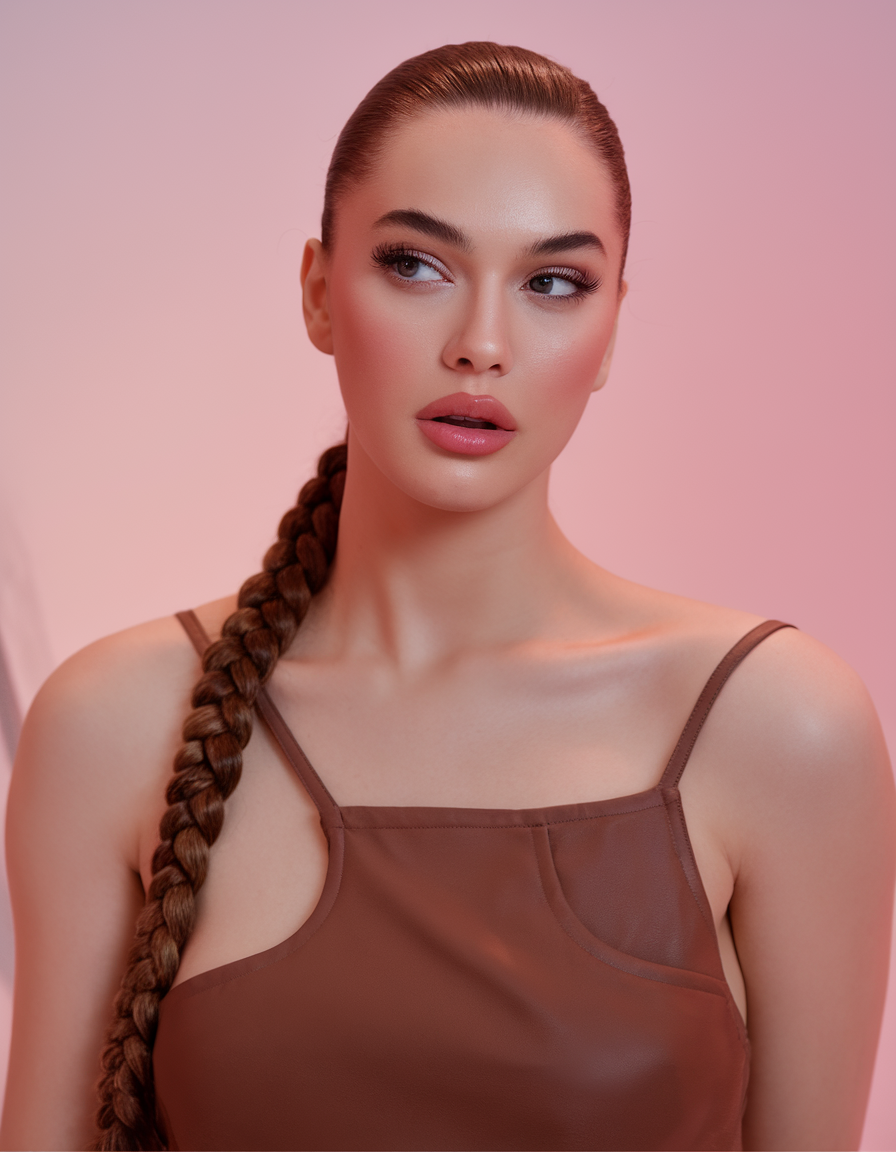 A long, tightly woven braid gives this look a sporty yet luxurious feel. The slicked-back crown keeps the style neat and modern, drawing attention to the smooth texture and shine of the hair. The thick, structured braid enhances the elegant appeal, making it an ideal choice for a sophisticated yet powerful aesthetic. This hairstyle pairs well with a minimalist outfit, letting the sleekness of the look take center stage.