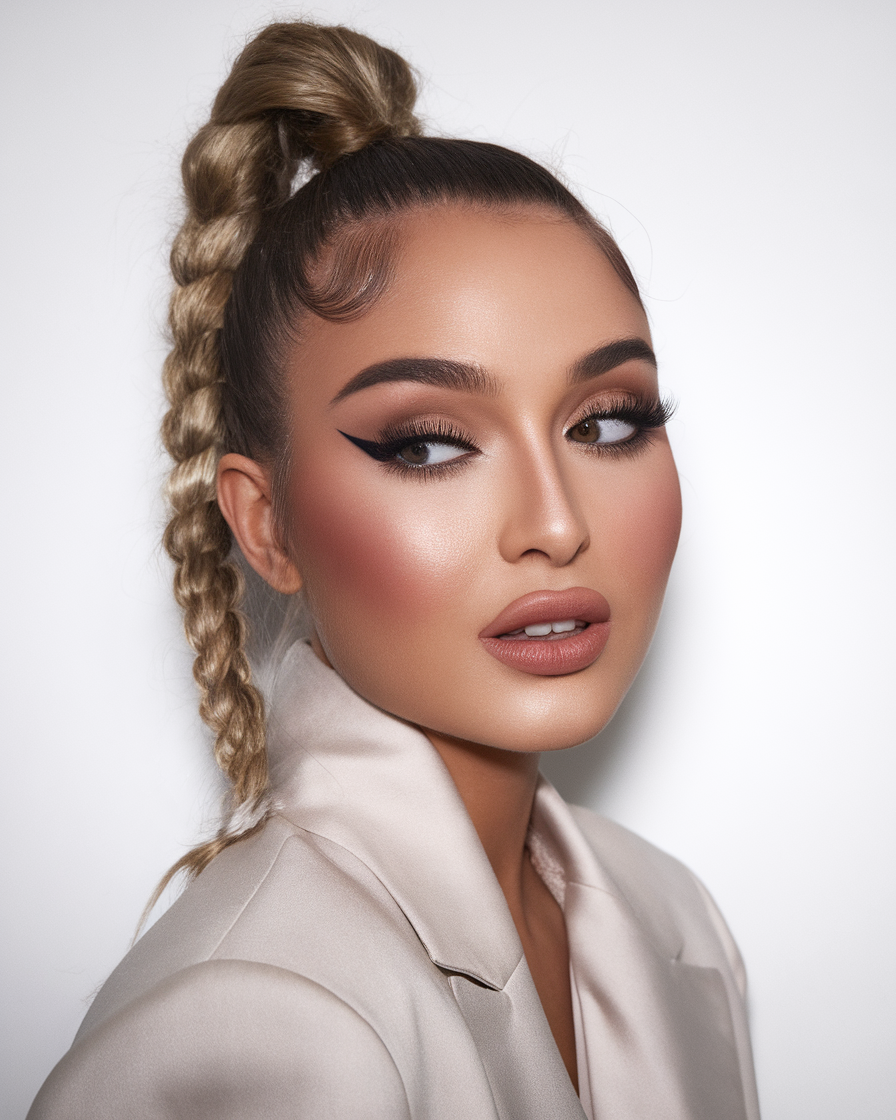 This chic high ponytail is braided tightly for a structured and elegant look. The blonde tone adds brightness, enhancing the polished and sophisticated feel of the hairstyle. The perfectly styled baby hairs create a clean and refined frame around the face, adding a touch of modern detail. This hairstyle balances a sporty yet classy aesthetic, making it a go-to for those who love both structure and style.