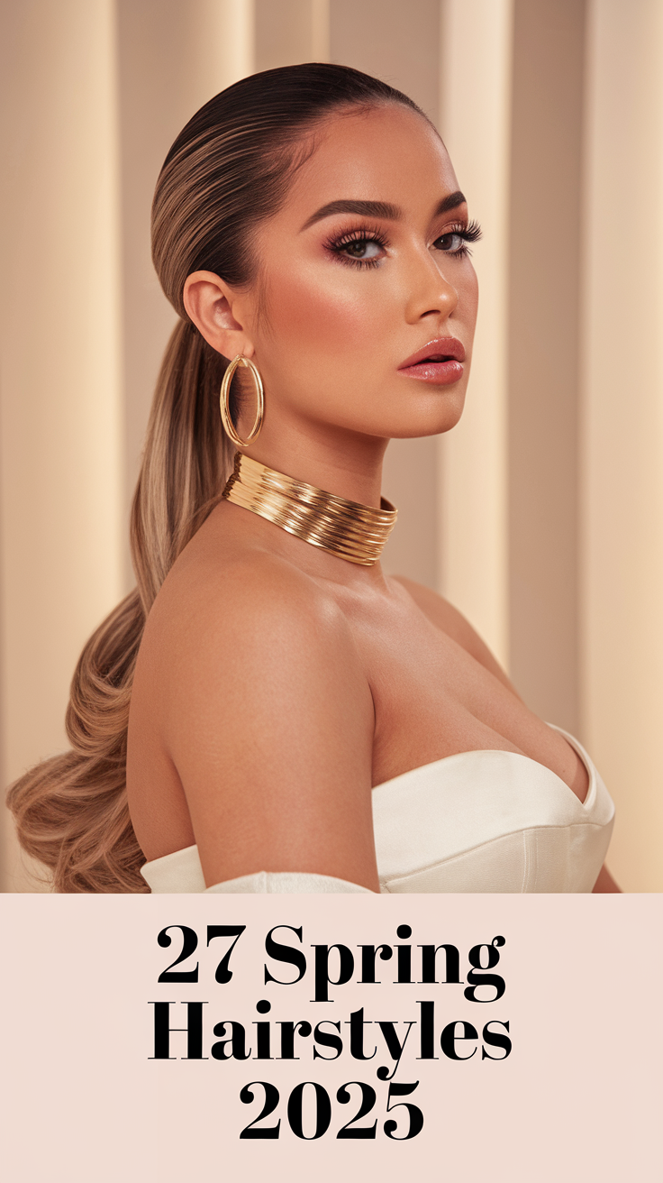 This hairstyle features a sleek top with a softly waved ponytail cascading down the back. The deep brown color enhances the polished and sophisticated look, perfect for long hair. It’s a timeless choice for both formal and casual spring events.