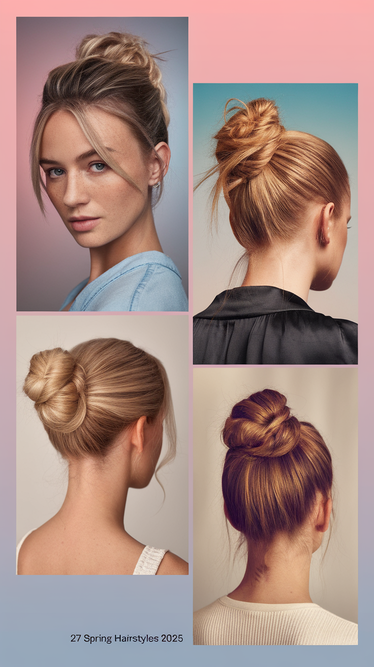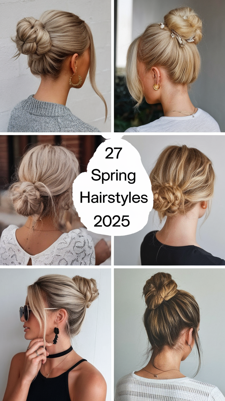 A chic high bun with plenty of volume is an easy and polished option for spring. This look works well with medium or long hair and features soft, face-framing tendrils for a touch of elegance. Perfect for both casual outings and formal events, this style is simple yet timeless.